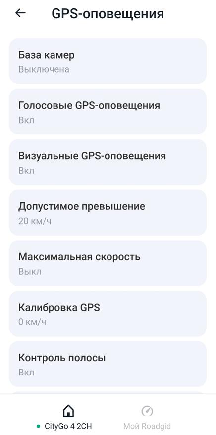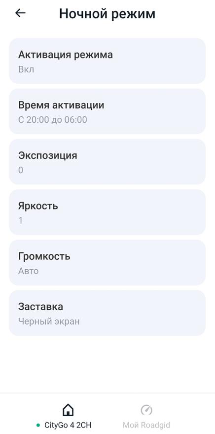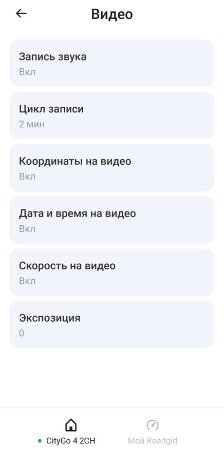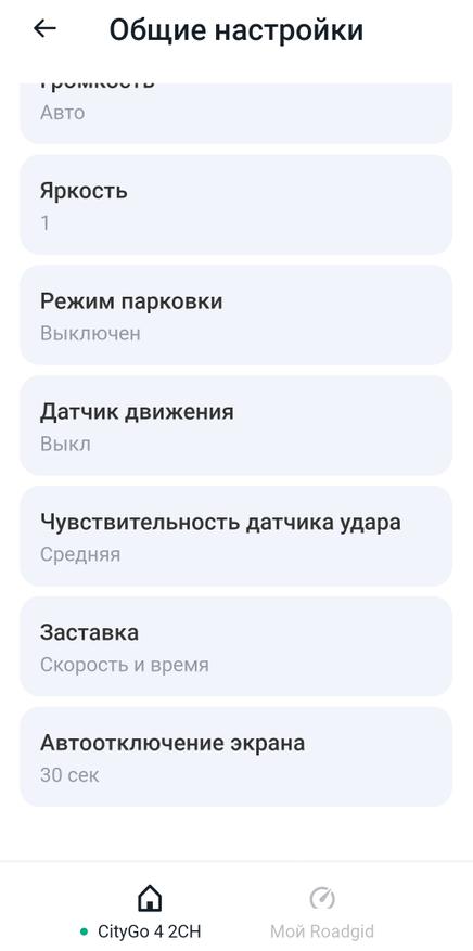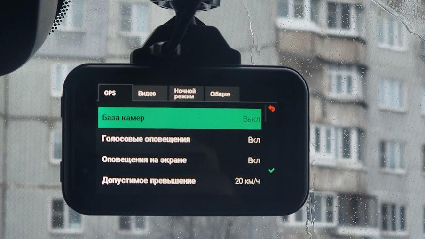 В каждой из вкладок доступен список опций, позволяющих выбрать тот или иной режим работы, настроить необходимые параметры съемки, срабатывания и так далее. Например, режим циклической записи можно настроить от 1 минуты (по умолчанию установлено 3 минуты). Можно ввести штампы скорости, времени и даты. Есть отдельные настройки оповещений о камерах контроля. Есть и экономичный режим работы экрана — отображаются часы и текущая скорость автомобиля.