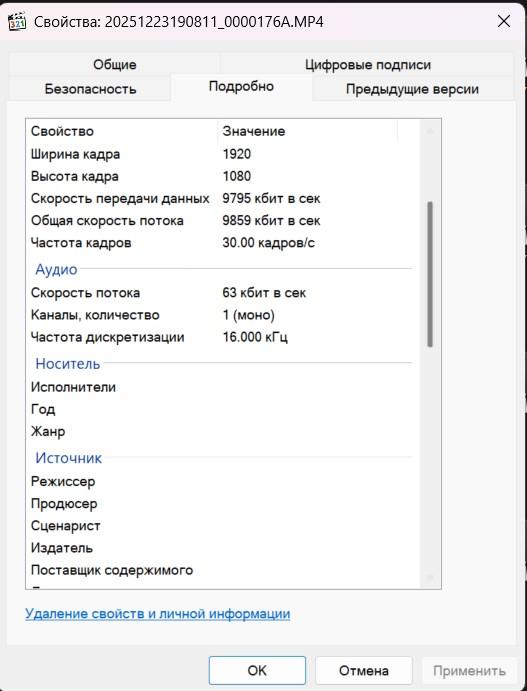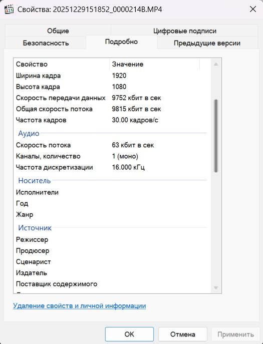 Свойства записей Sony IMX675 (5 Мп). Как видно, в двухканальном режиме видеорегистратор Roadgid CityGo 4 2СH пишет с одинаковым разрешением 1920х1020 FHD.