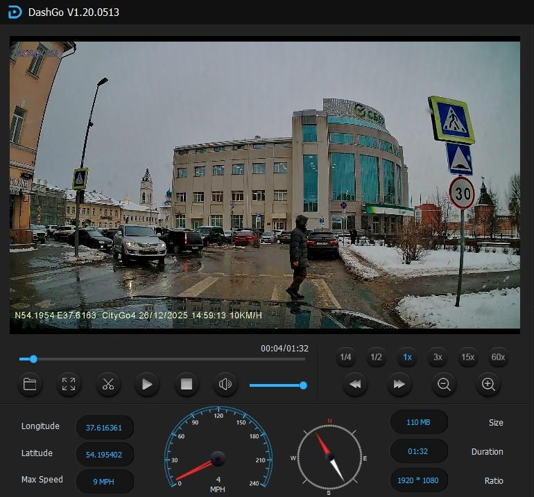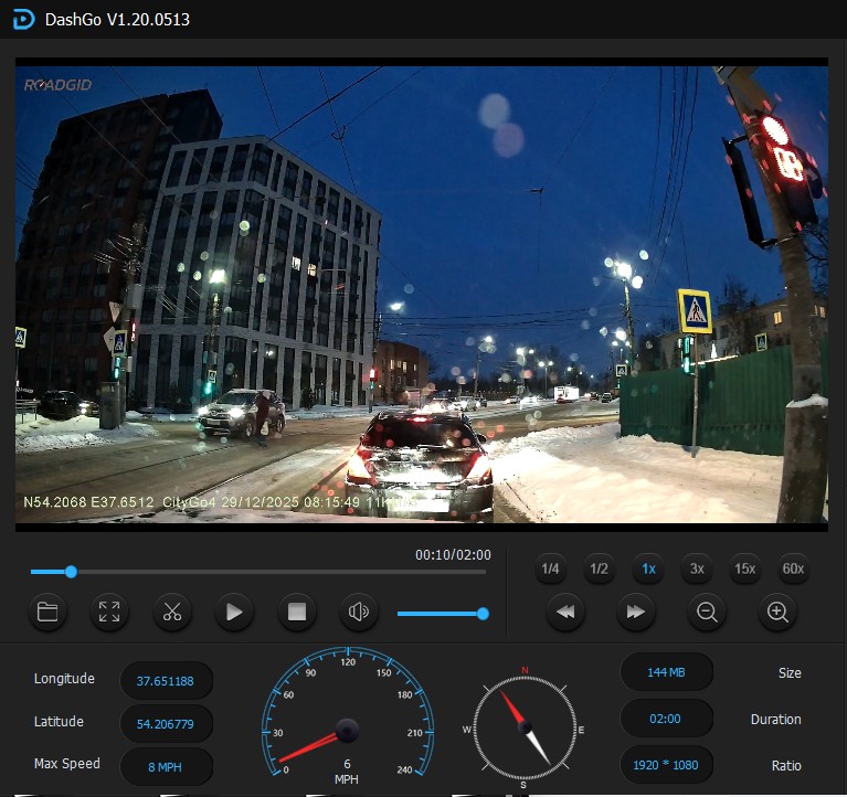 Прикладываю примеры роликов, записанных на видеорегистратор Roadgid CityGo 4 2CH. Можно воспользоваться приложением GPS плеер для просмотра. Это приложение дополнительно позволяет визуализировать скорость, направление, а также координаты авто.
