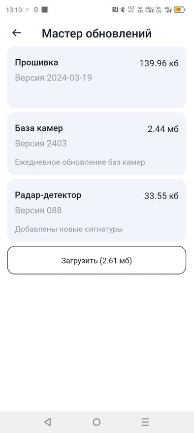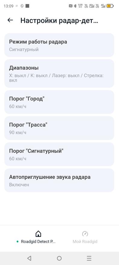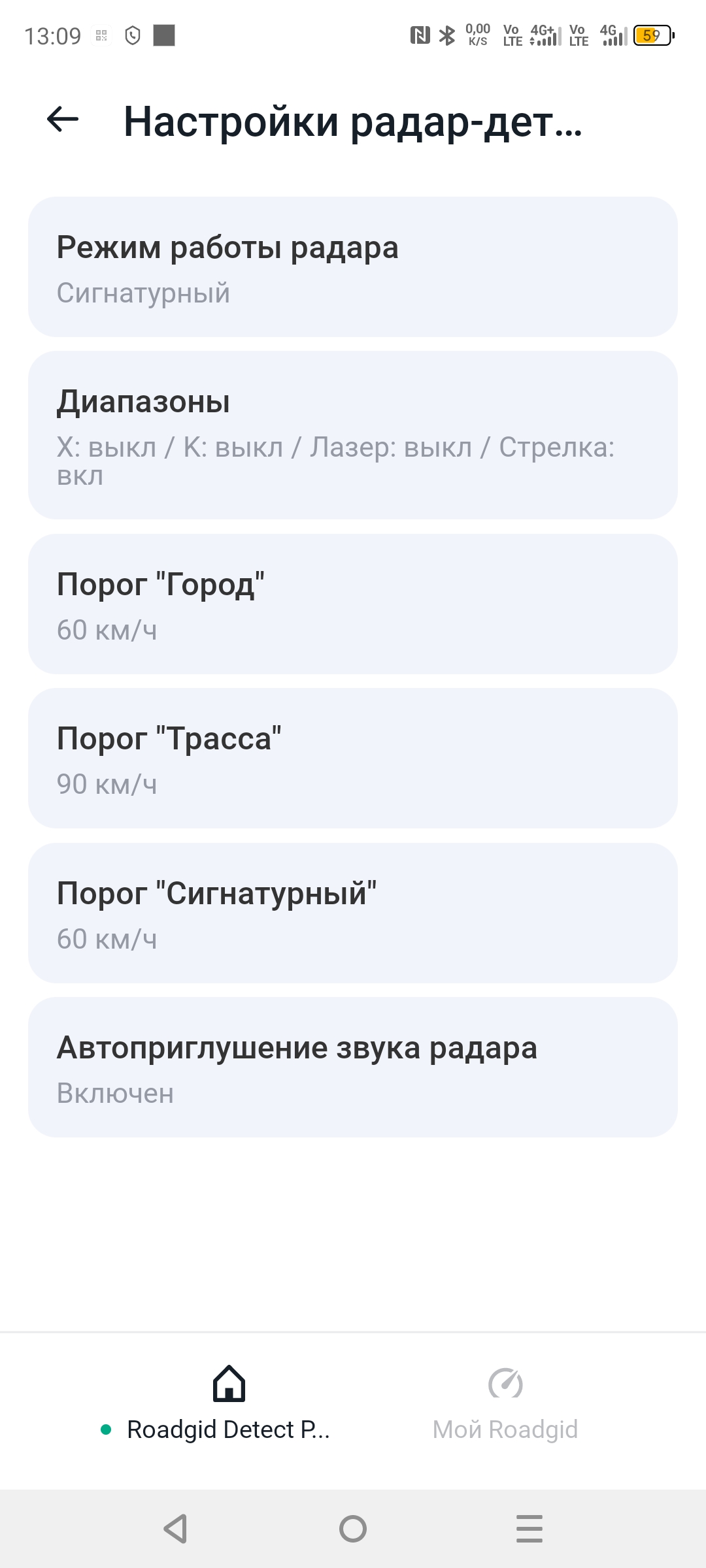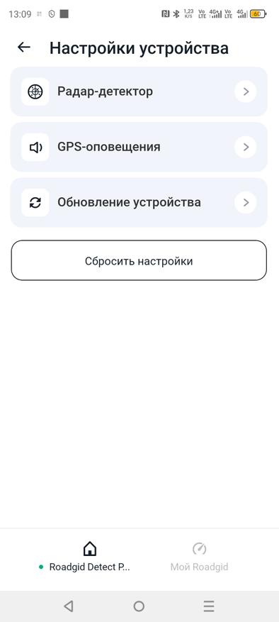 В настройках всего три пункта, где один отвечает за обновление, а два других — за настройки самого радара. В настройках радара выбирается тип использования: город или трасса, а также установка скоростного режима.