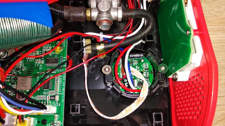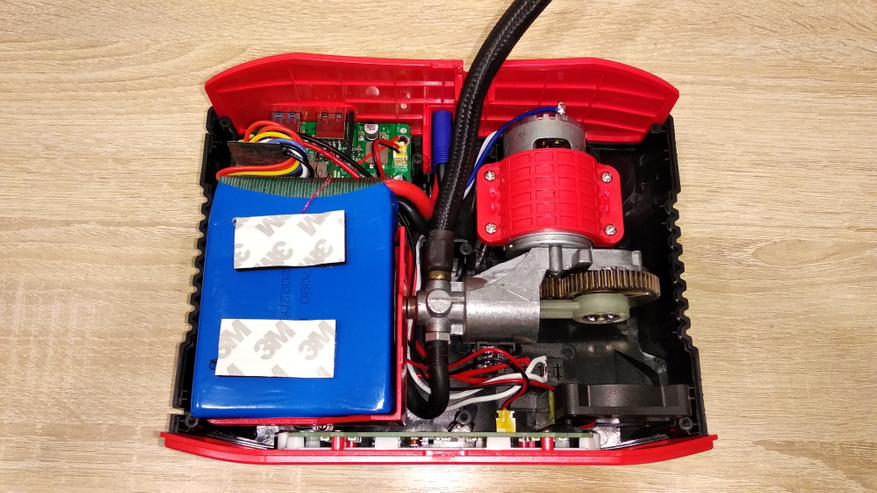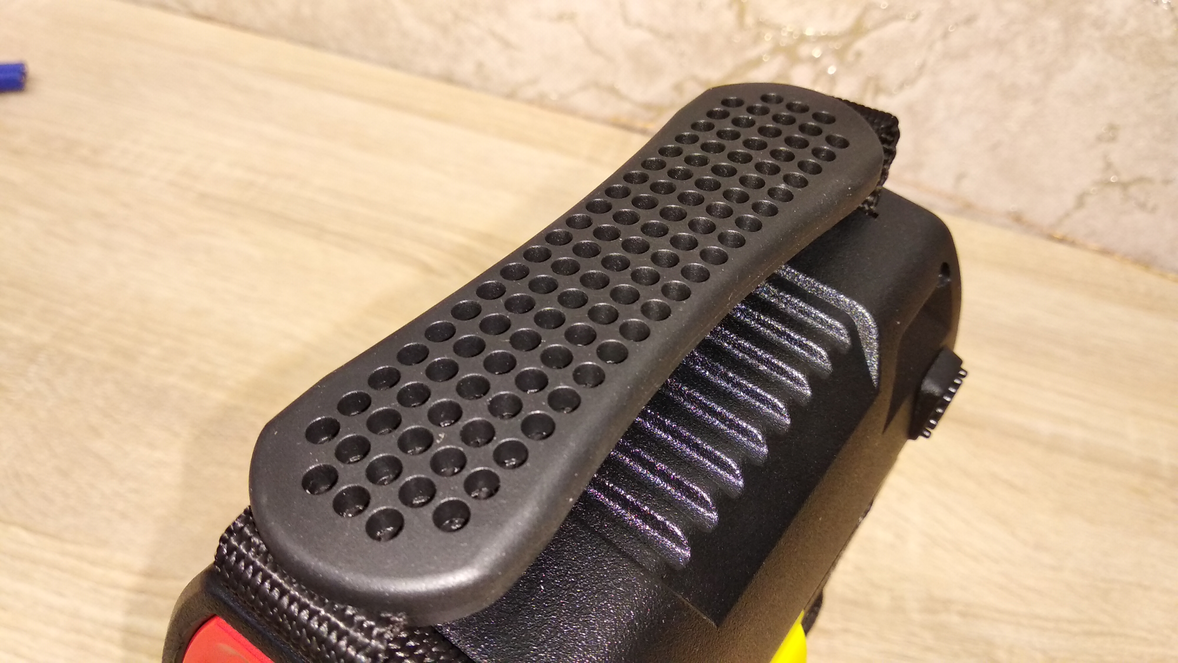 Есть две заглушки, закрывающие разъемы от воды и грязи. Под одной находятся входной и выходные разъемы USB, а также стандартный цилиндрический разъем, под другой основнойсиловой коннектор пускового устройства. На правом торце есть белый рассеиватель, который скрывает матрицу из светодиодов, а они в свою очередь будут работать в качестве фонаря. Всю тыловую часть занимает смотанный выходной шланг компрессора.