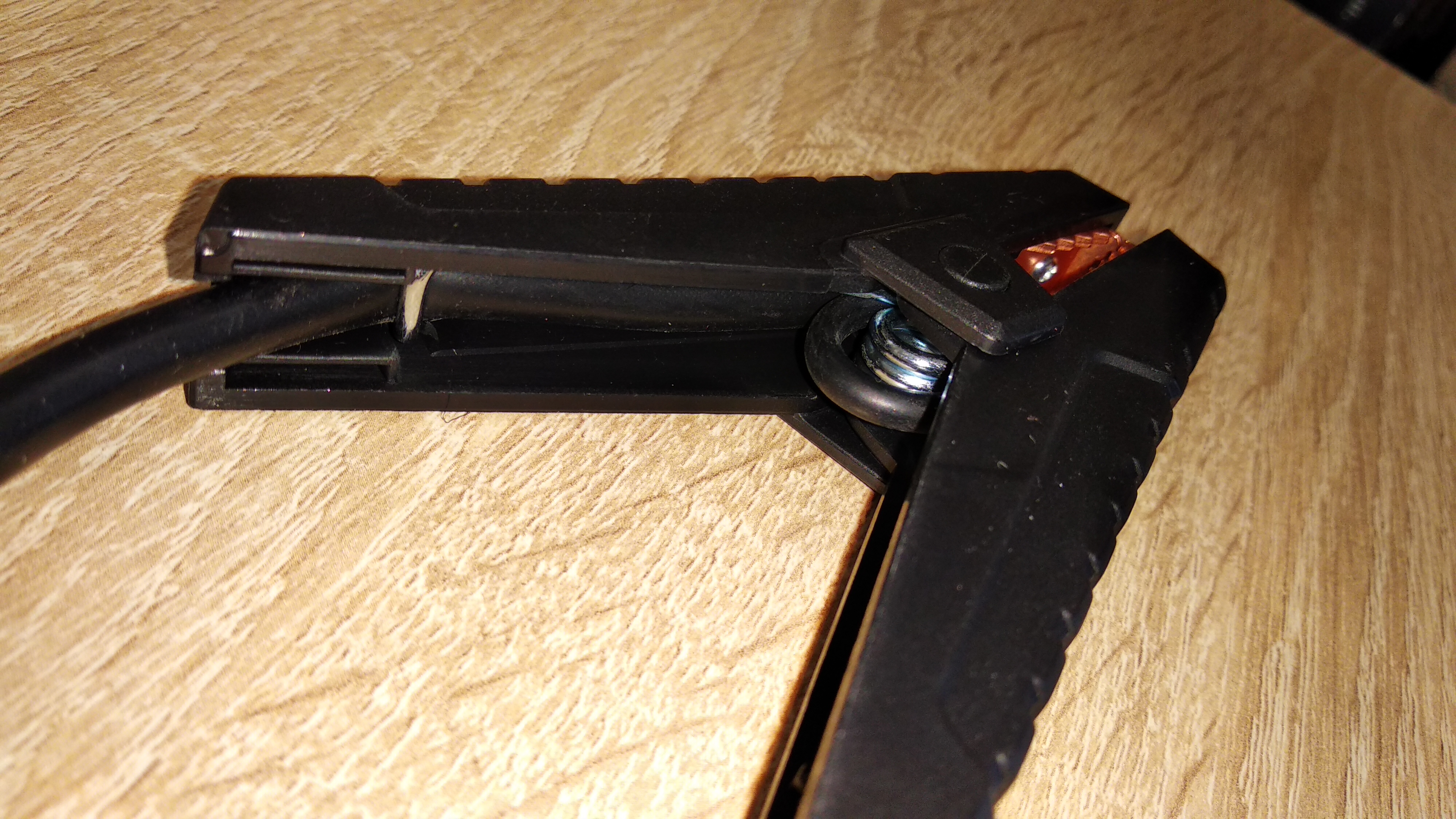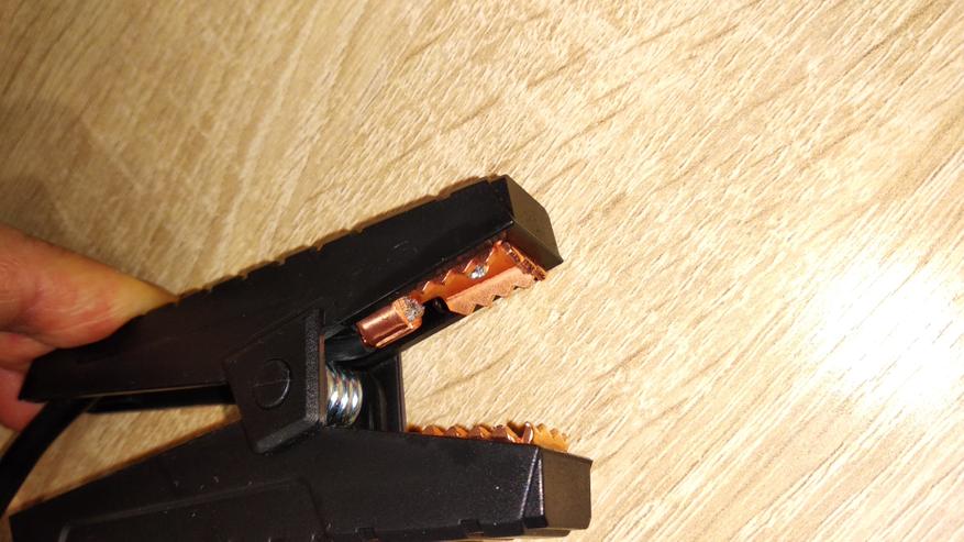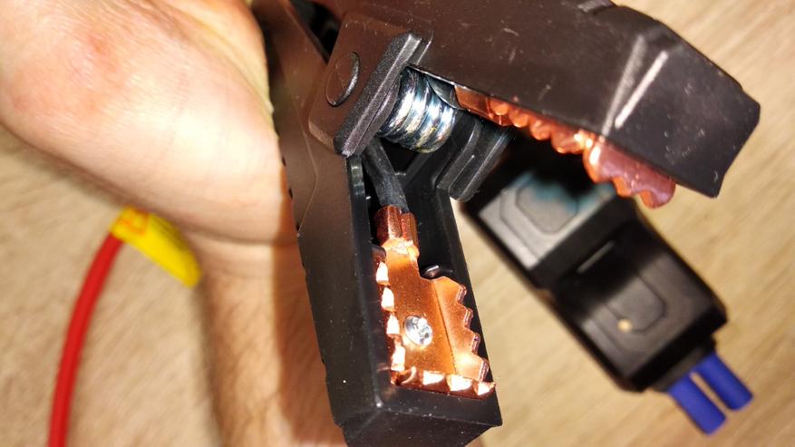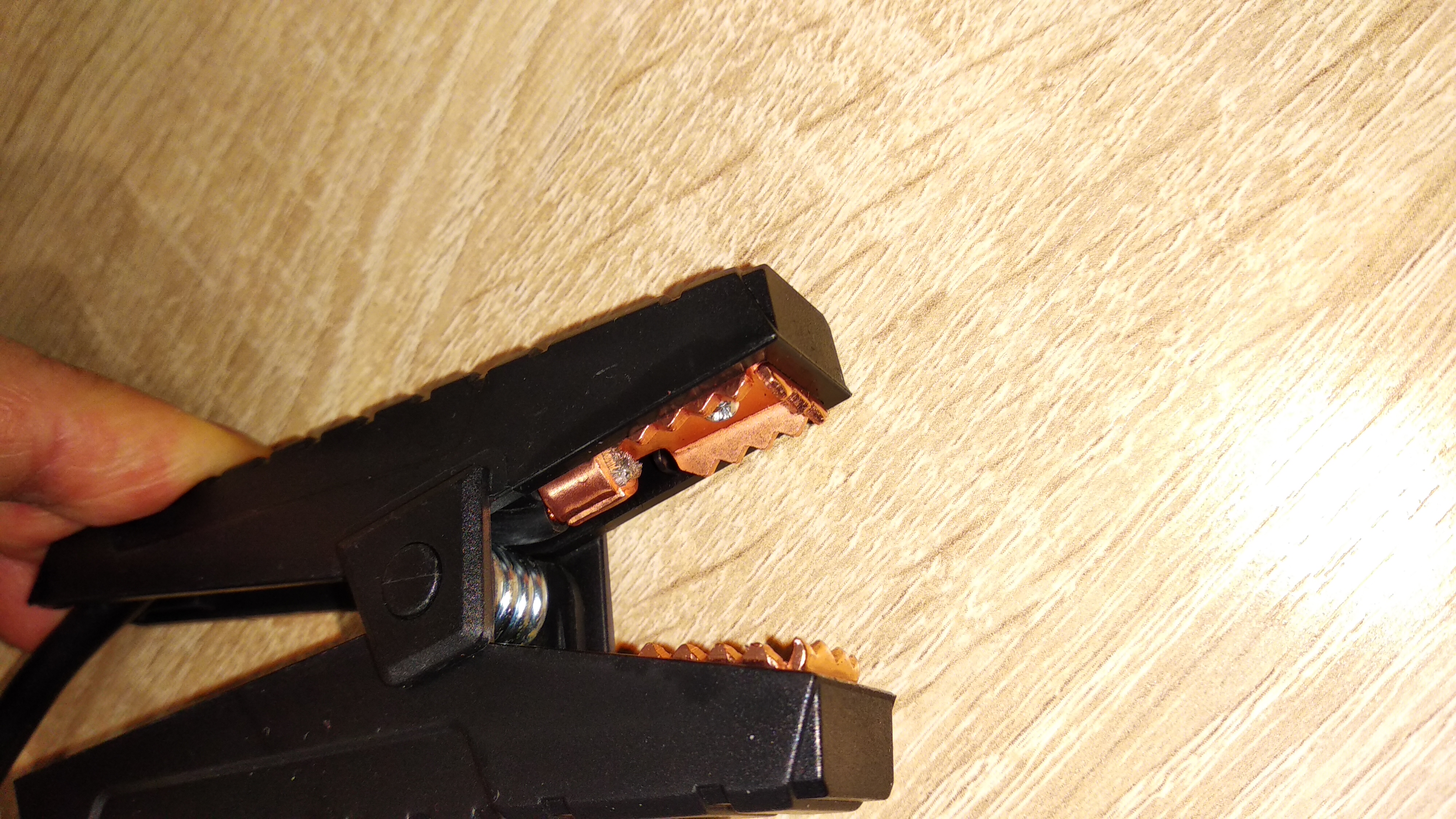 Крокодилы с очень жёсткой пружиной и на коротких мягких проводах. Зубы выполнены из меди, я их царапал, белый блеск не появился. Провод подходит к обеим половинам — между ними есть перемычка. Я видел крокодилы с подходящей жилой только к одной стороне. На корпусе коннектора есть краткая инструкция, как использовать.