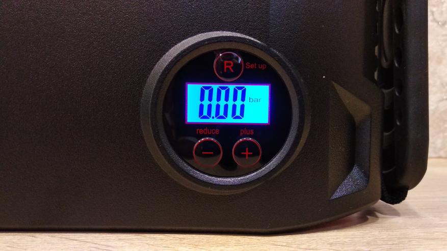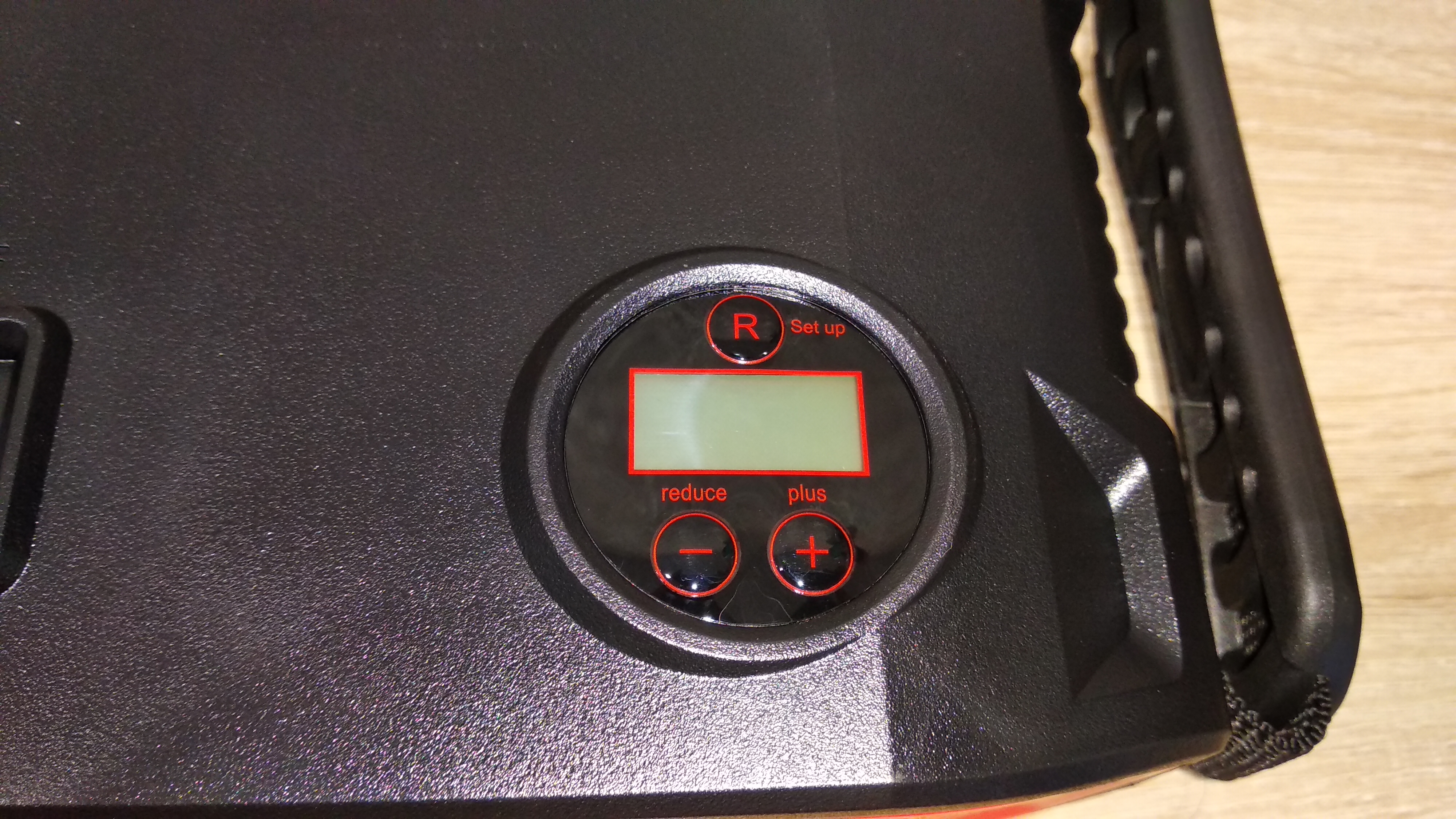 Включается устройство красной кнопкой, при этом загорается экран с уровнем заряда. Под ними есть ещё экран с кнопками управления компрессором, там можно выбрать целевое давление, а также в нужных единицах измерения. Слева от этого блока управления есть двухпозиционная кнопка питания, которая включает и отклбчает компрессор.