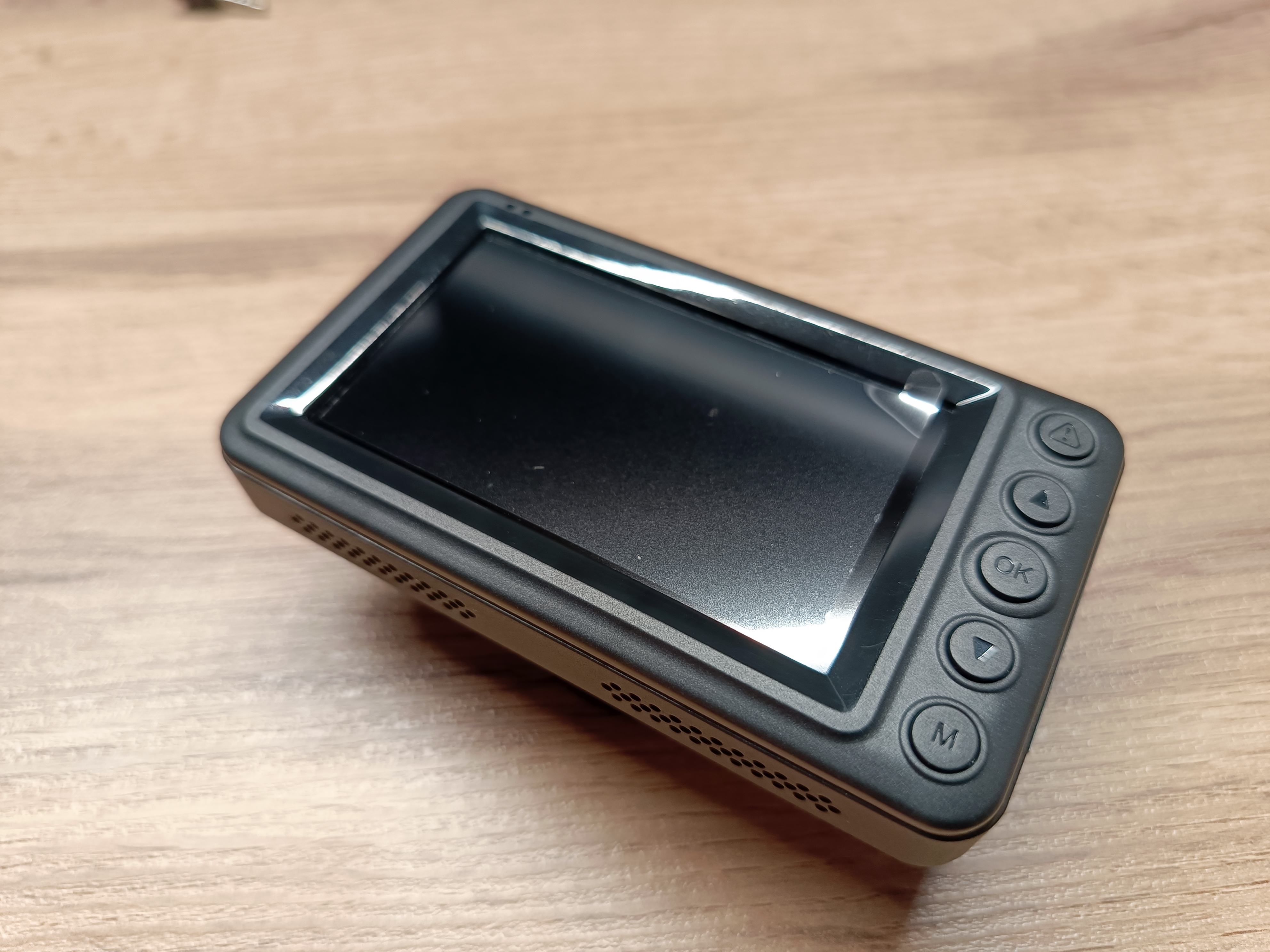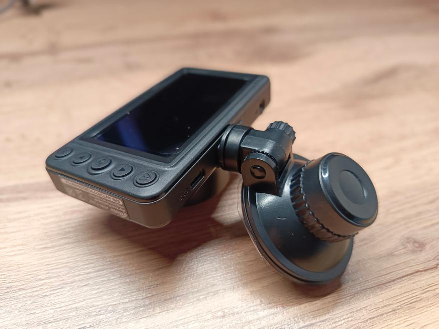 Регистратор классической прямоугольной формы. Матовый черный пластик с пятью механическими кнопками. Крепится на лобовое стекло с помощью присоски с поворотным затвором.