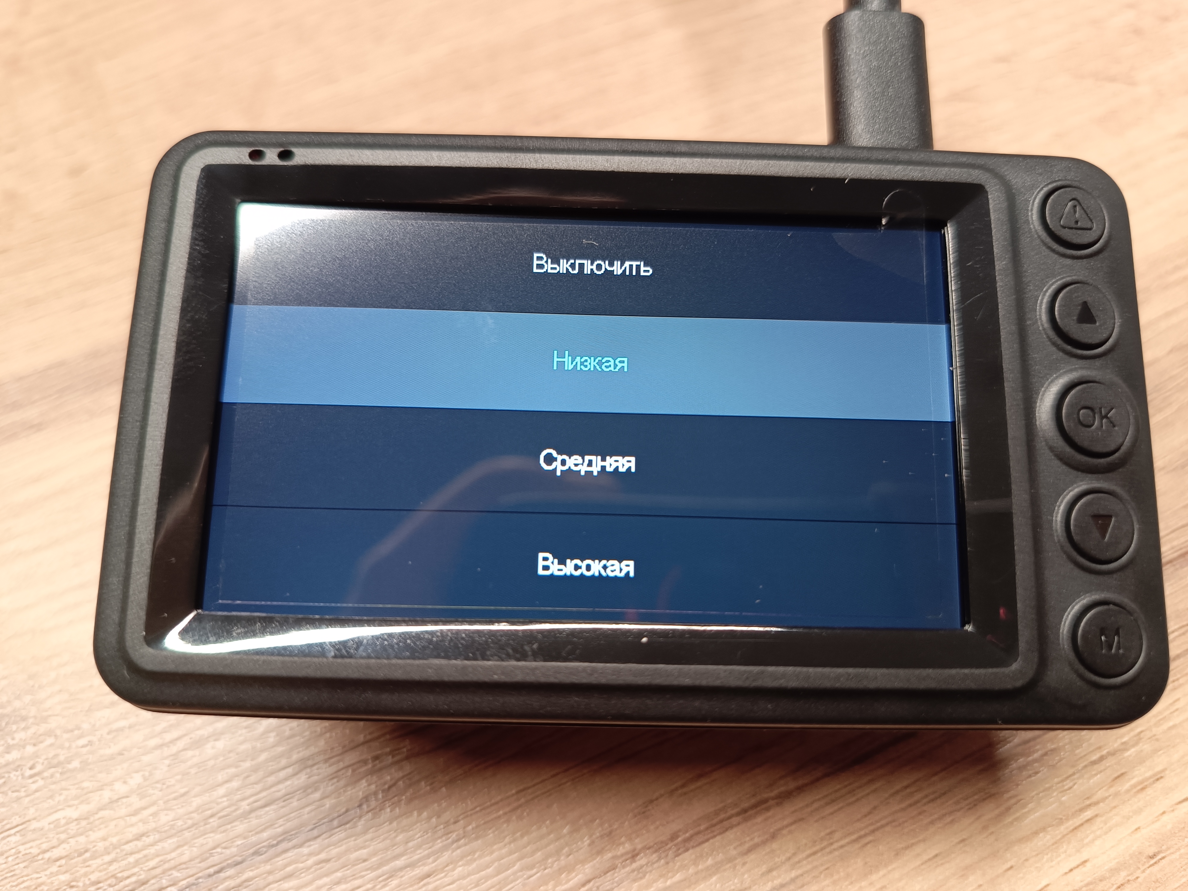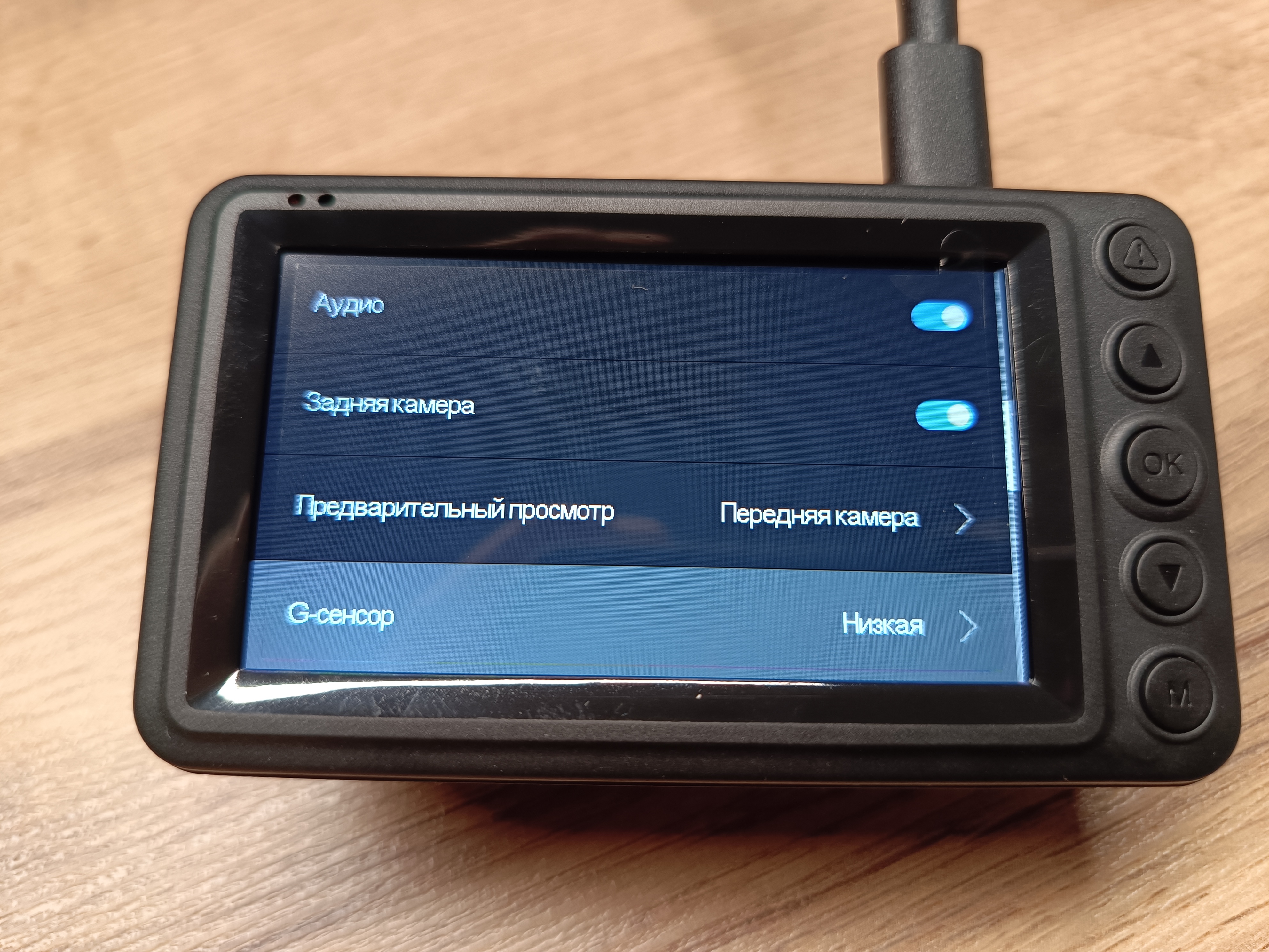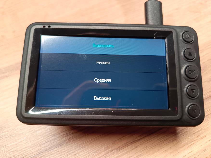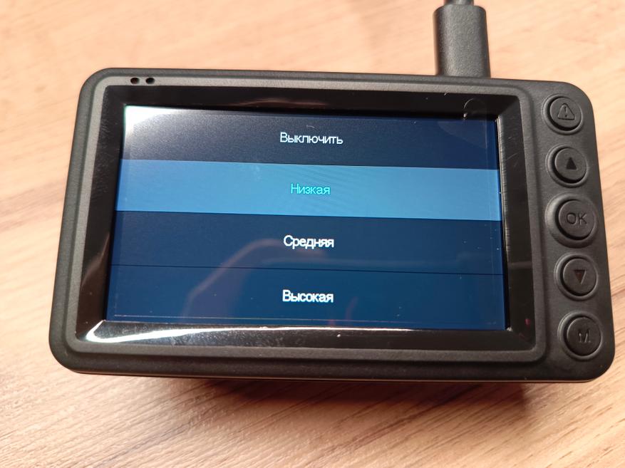 Установлен G-sensor, который при толчках и ударах автомобиля будет защищать видеофайл от циклической перезаписи, есть несколько режимов настройки чувствительности, предустановлен низкий уровень.