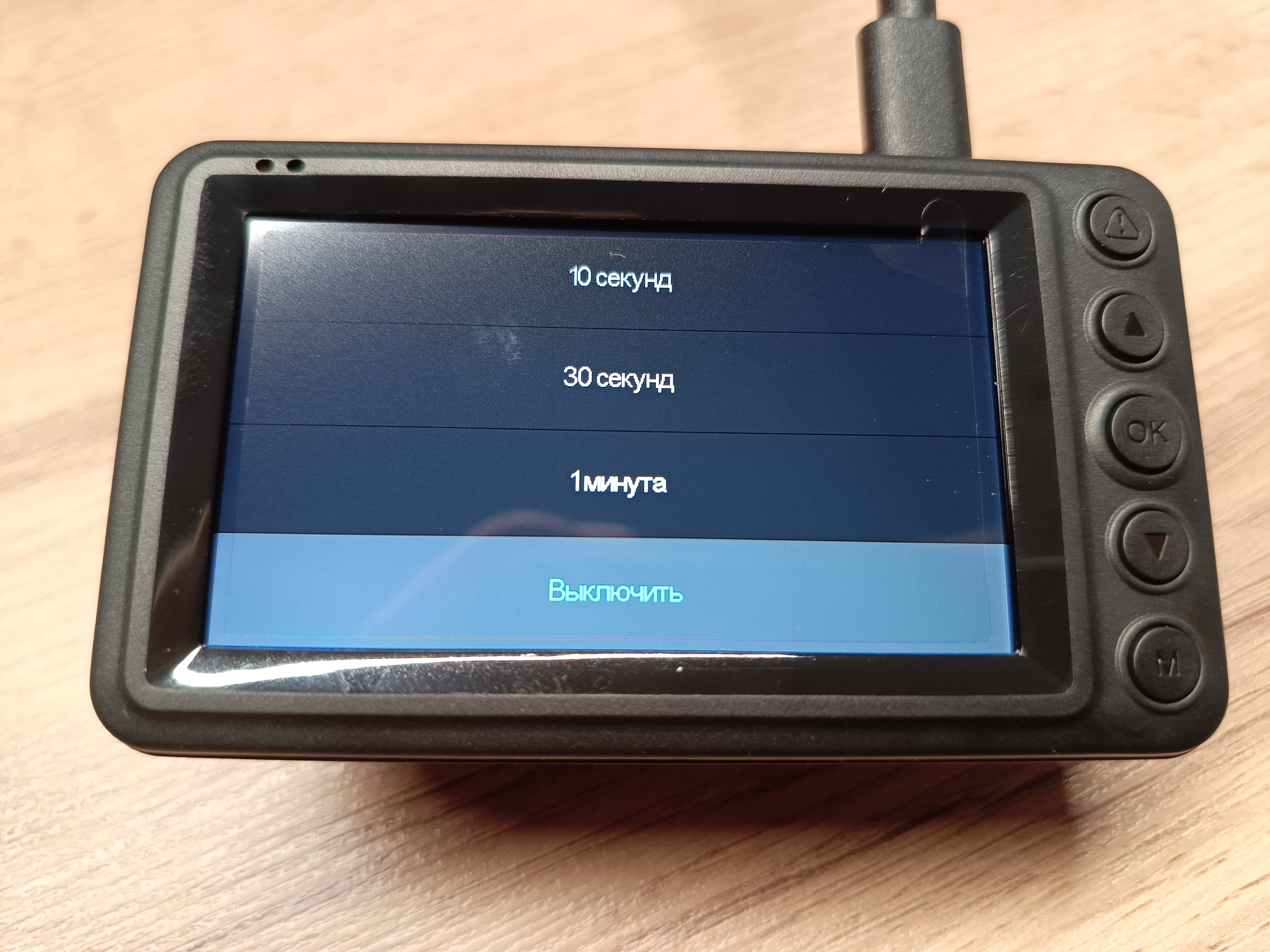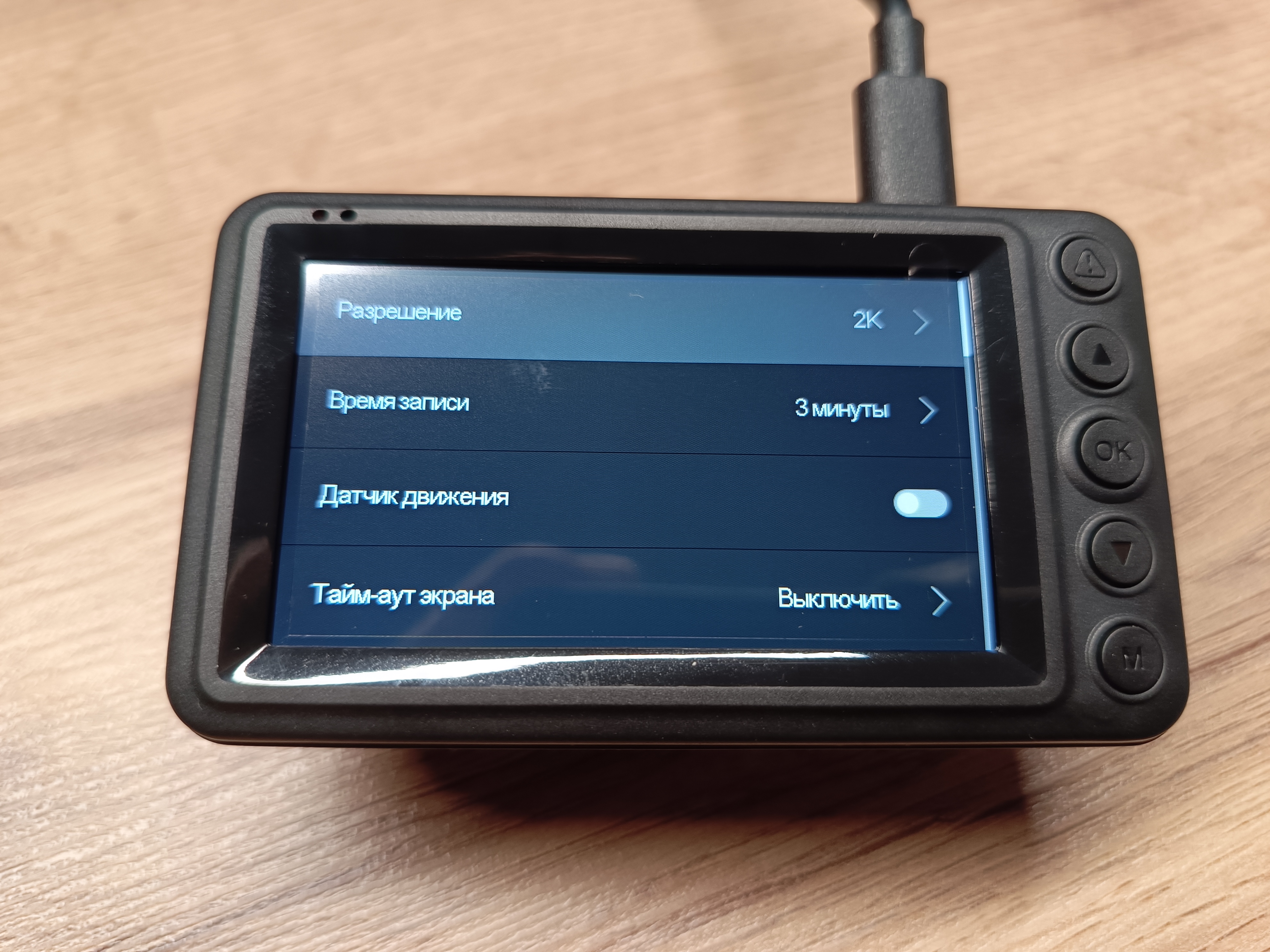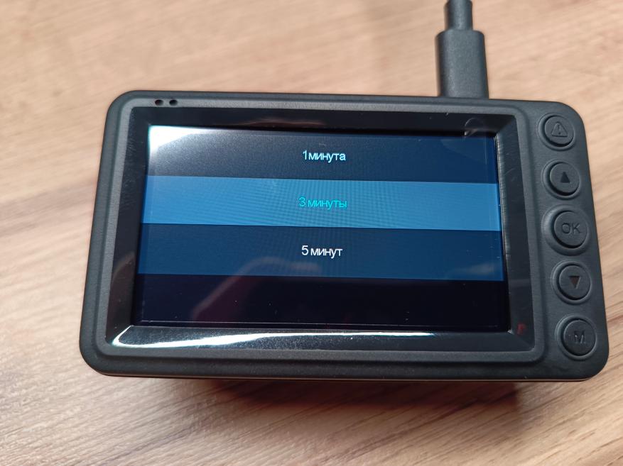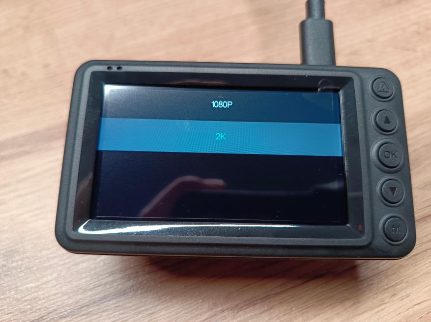 Меню интуитивно понятное и переведено на русский язык. Для записи можно выбрать два варианта разрешения: 2.5К и 1080P, при этом для каждого разрешения можно установить временной интервал одного файла в 1, 2 или 5 минут.