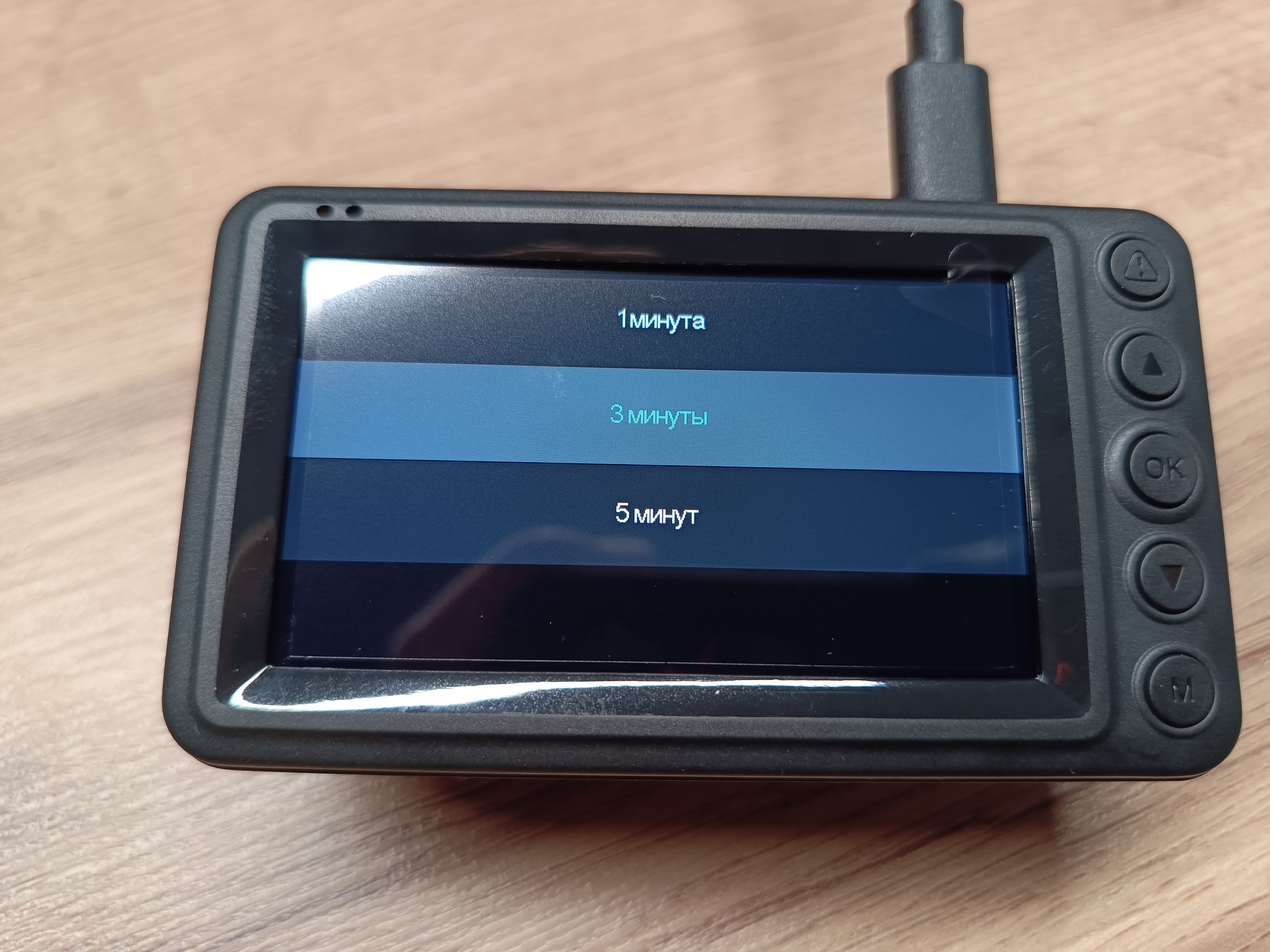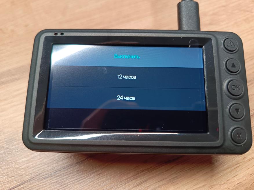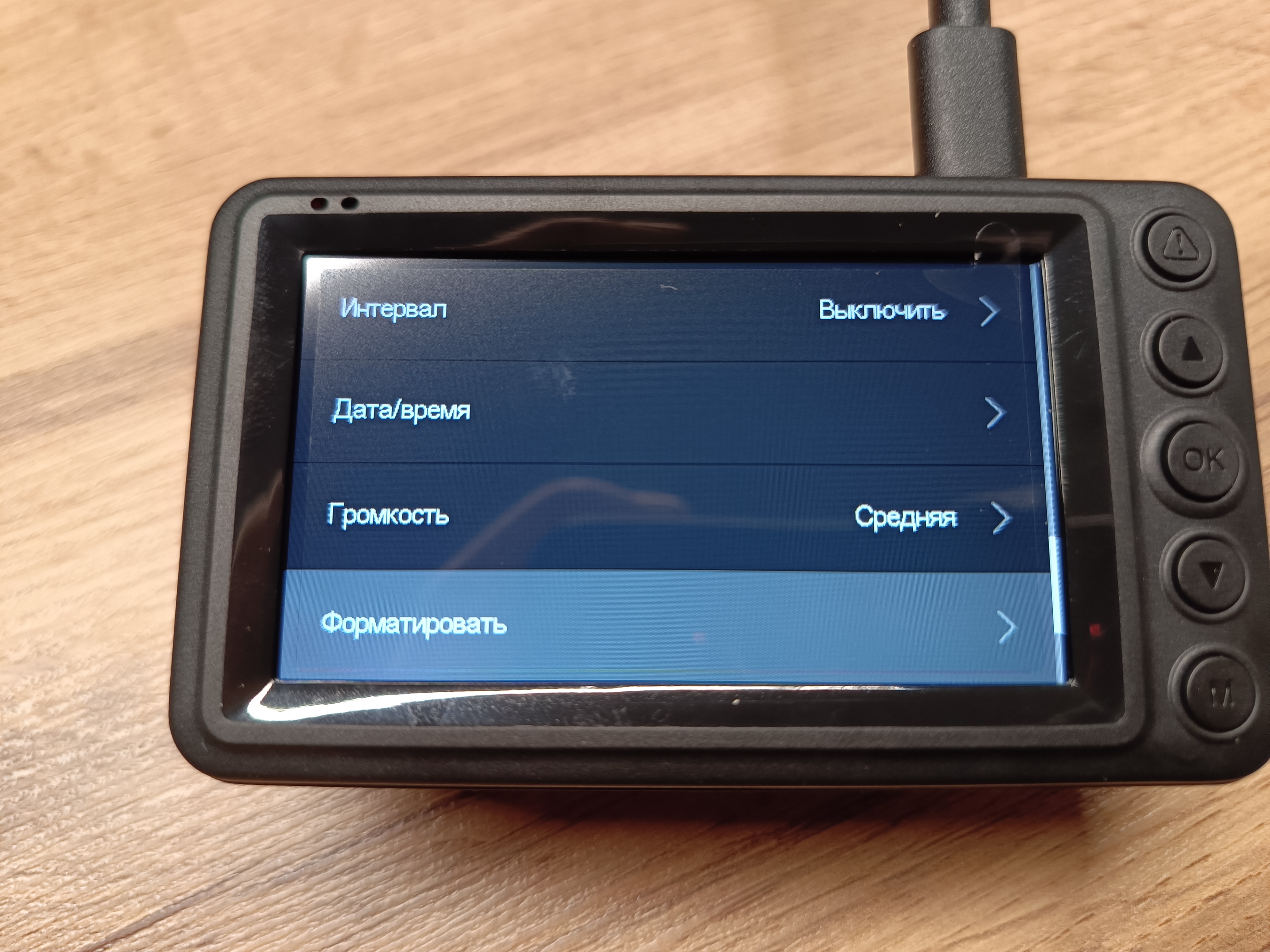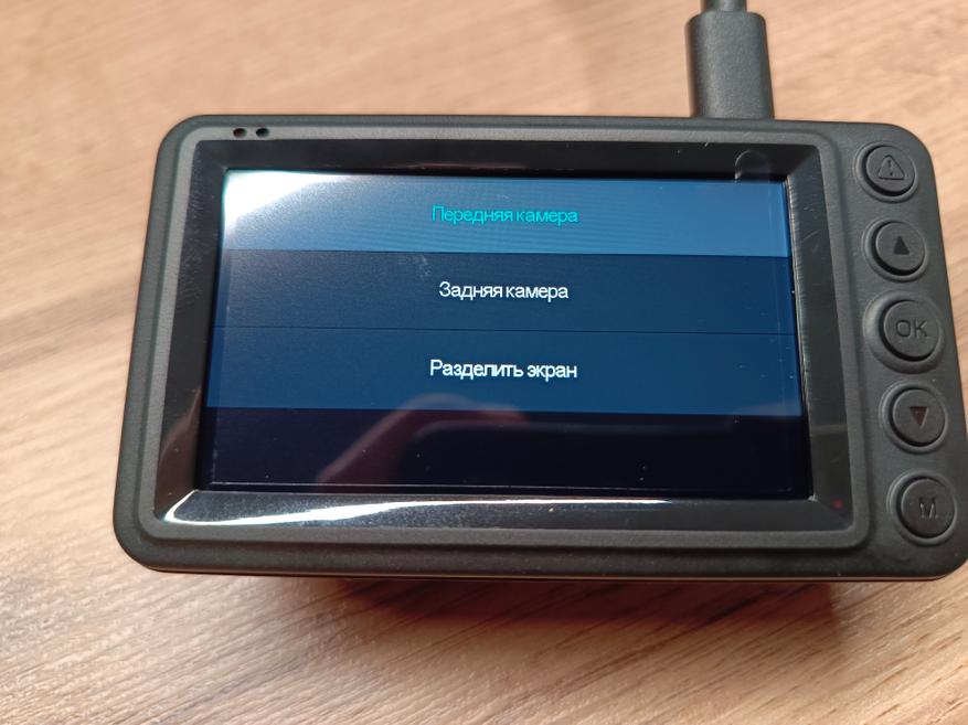 На экран может выводиться изображение с передней или с задней камеры, а можно совместить обе камеры, и экран будет поделен на две половины. Остальные настройки — это форматирование карты памяти, уровень громкости — стандартный основной набор настроек, который один раз выставил и забыл.