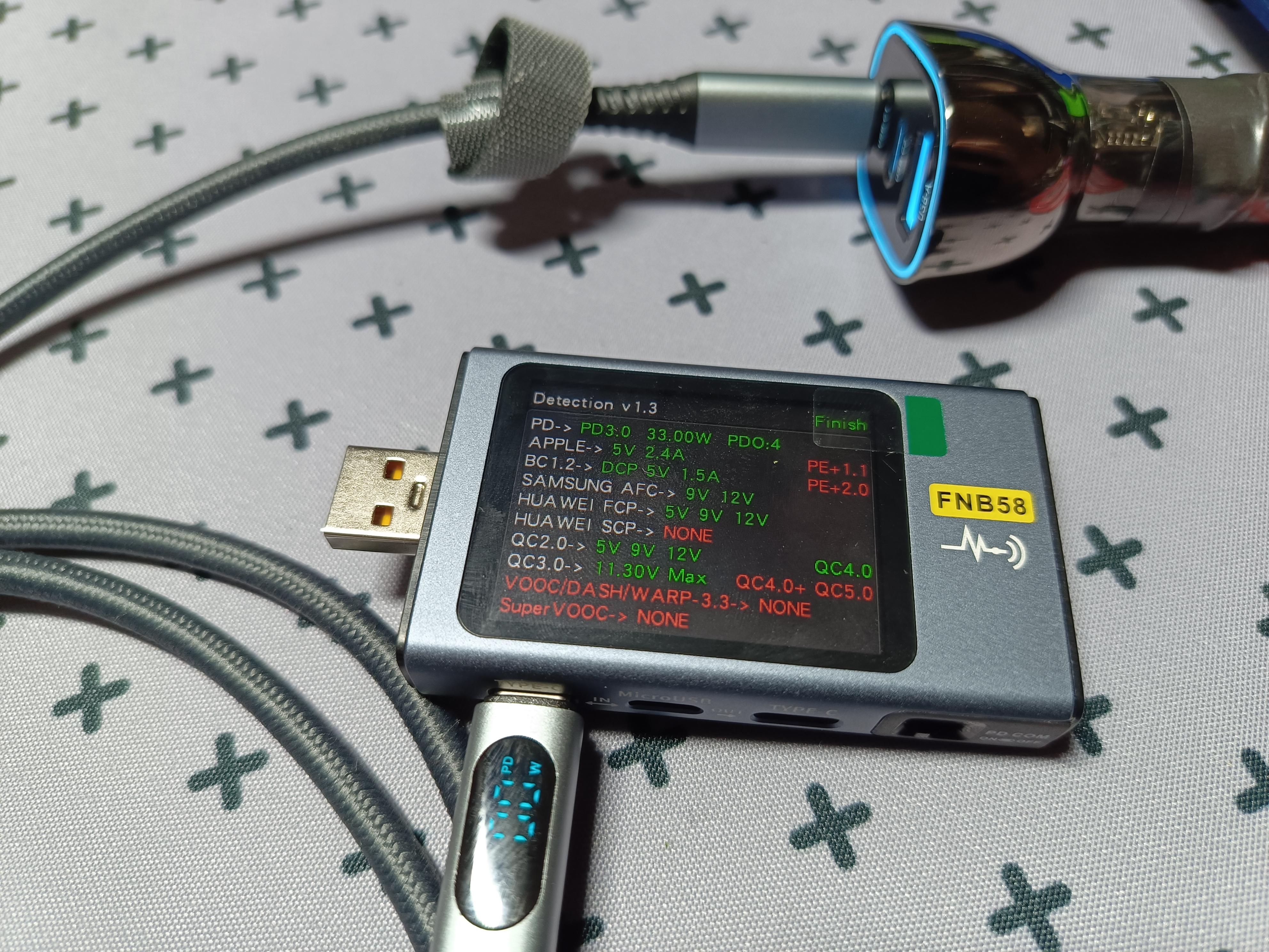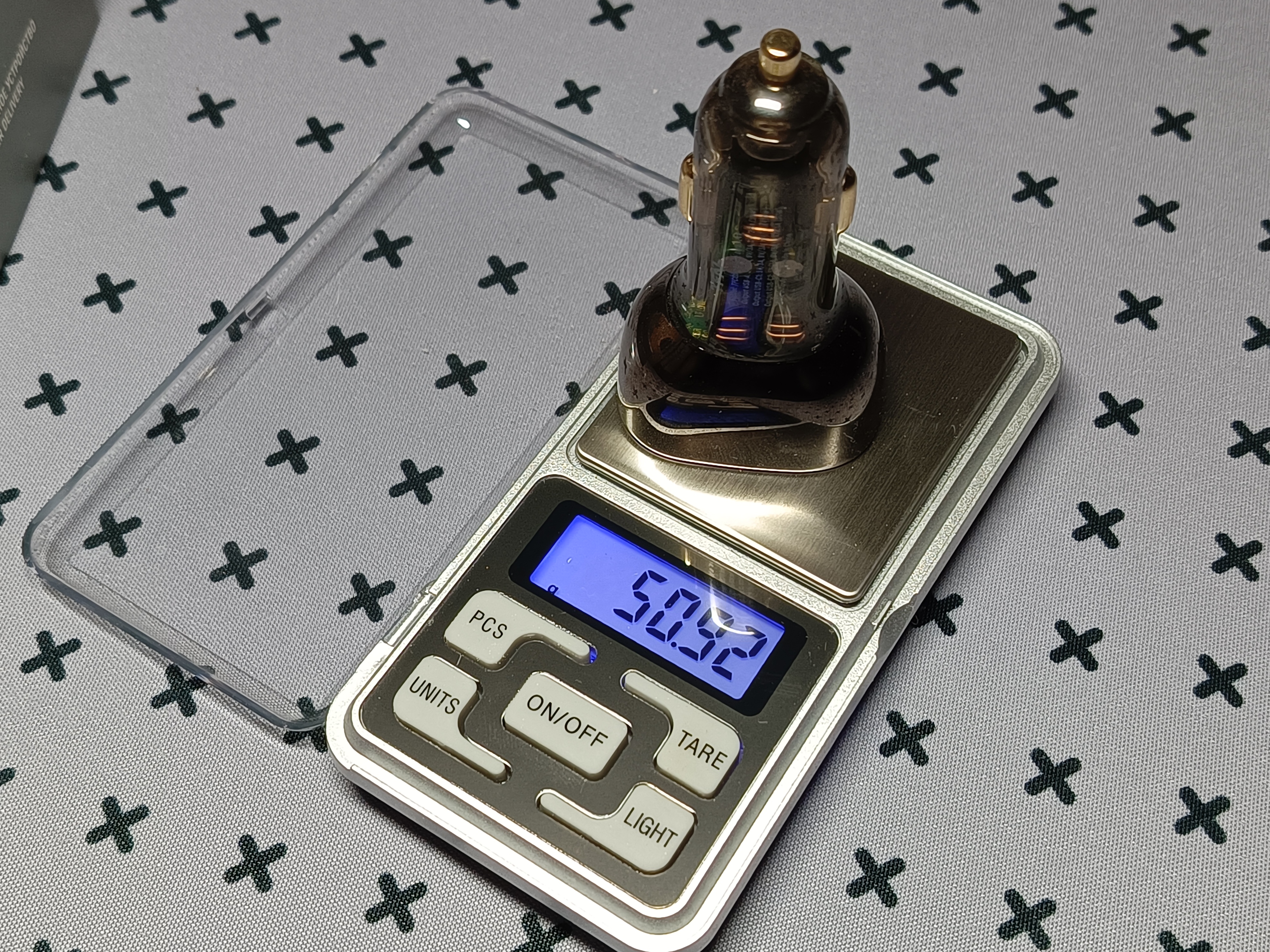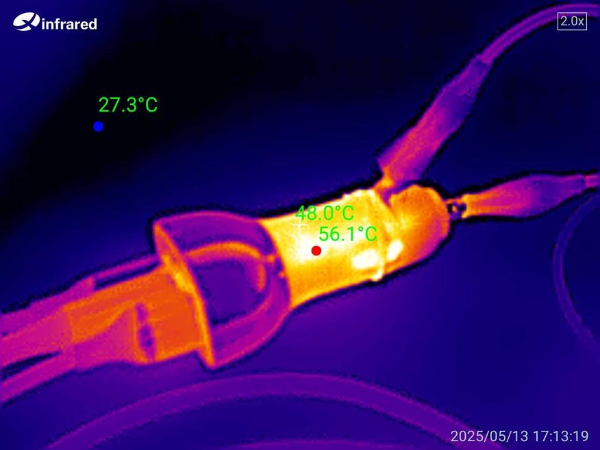 Нагрузив зарядку электронной нагрузкой и гаджетами, получил общую мощность в 85 Вт. Температура поднялась до 56°C. Зарядка работала при комнатной температуре около 25°C, так что в машине, вероятней всего, летом будет нагреваться сильнее из-за жары, а зимой меньше.