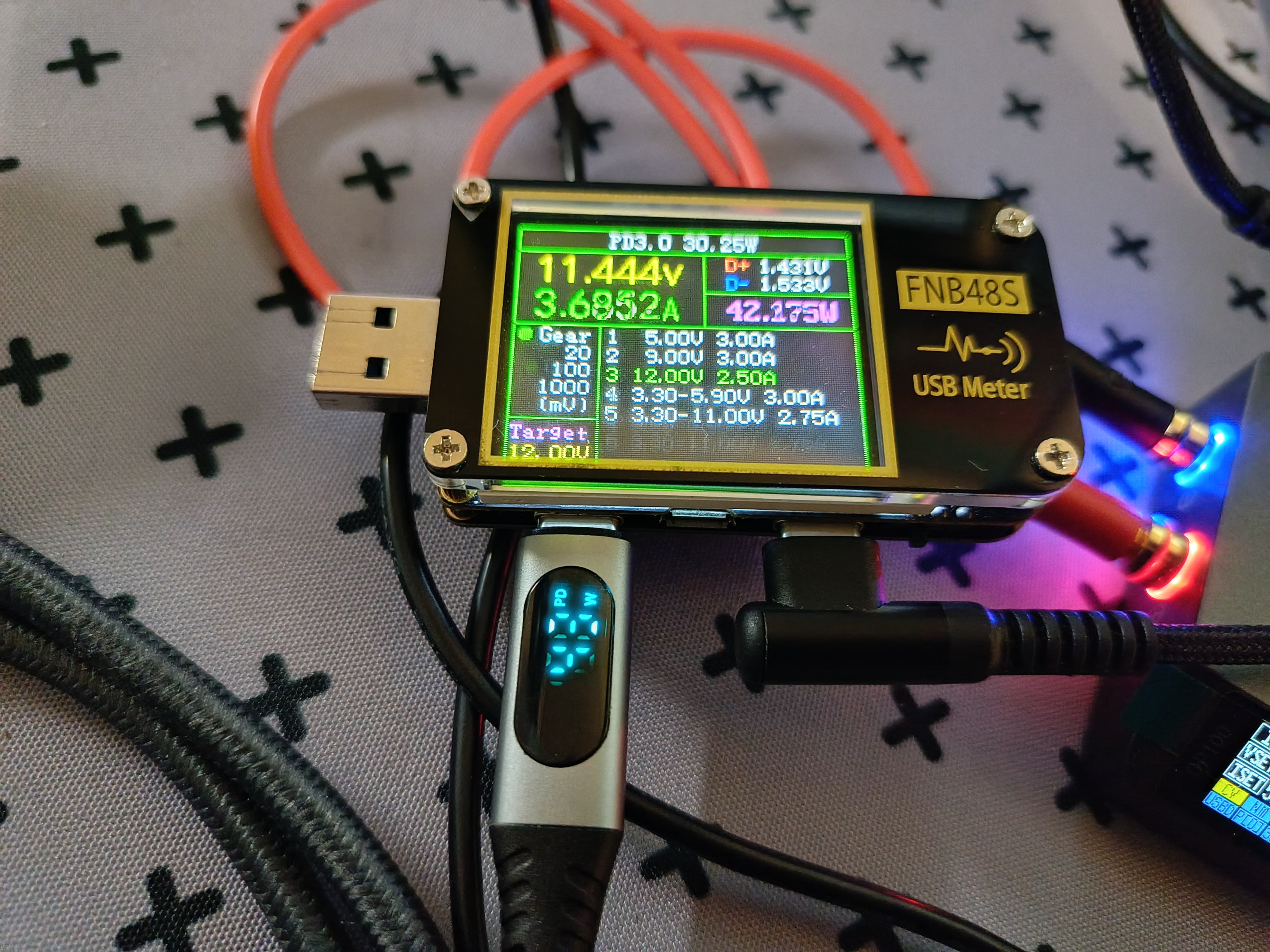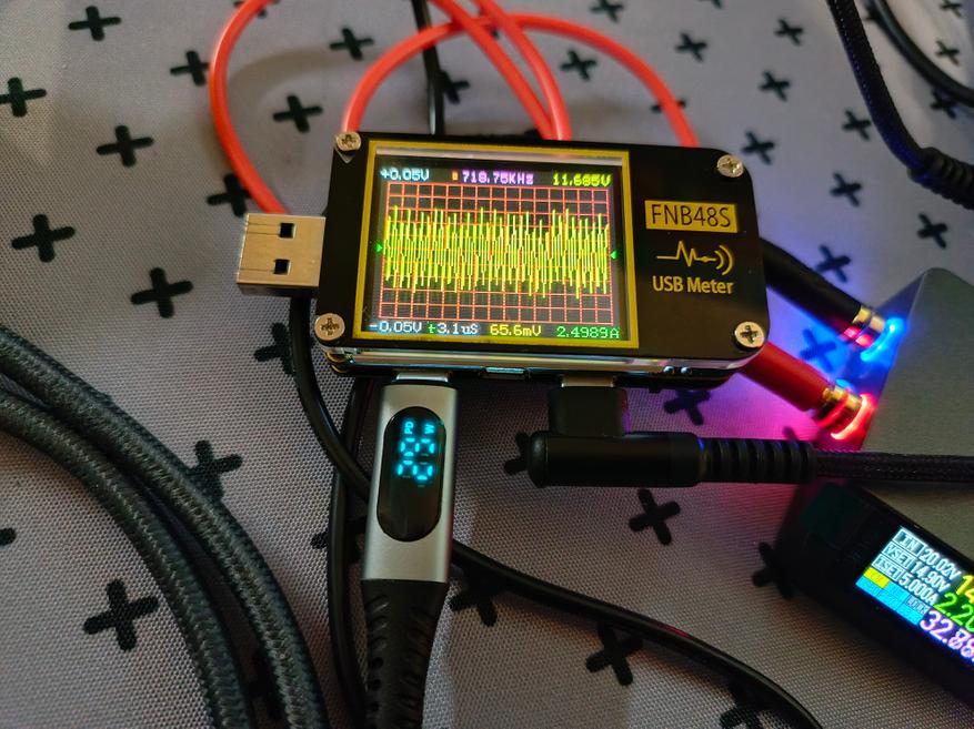 Мне стало интересно, на что способна эта зарядка и когда сработает защита от перегрузок. Я начал плавно подымать силу тока с шагом в 100 мА, и зарядка держалась до 3,7 А, при повышении ещё на 100 мА ЗУ уходит в защиту и выключается. То есть пиковая нагрузка 43 В, причем на каждый разъем. Весьма неплохой запас почти в 14 Вт.