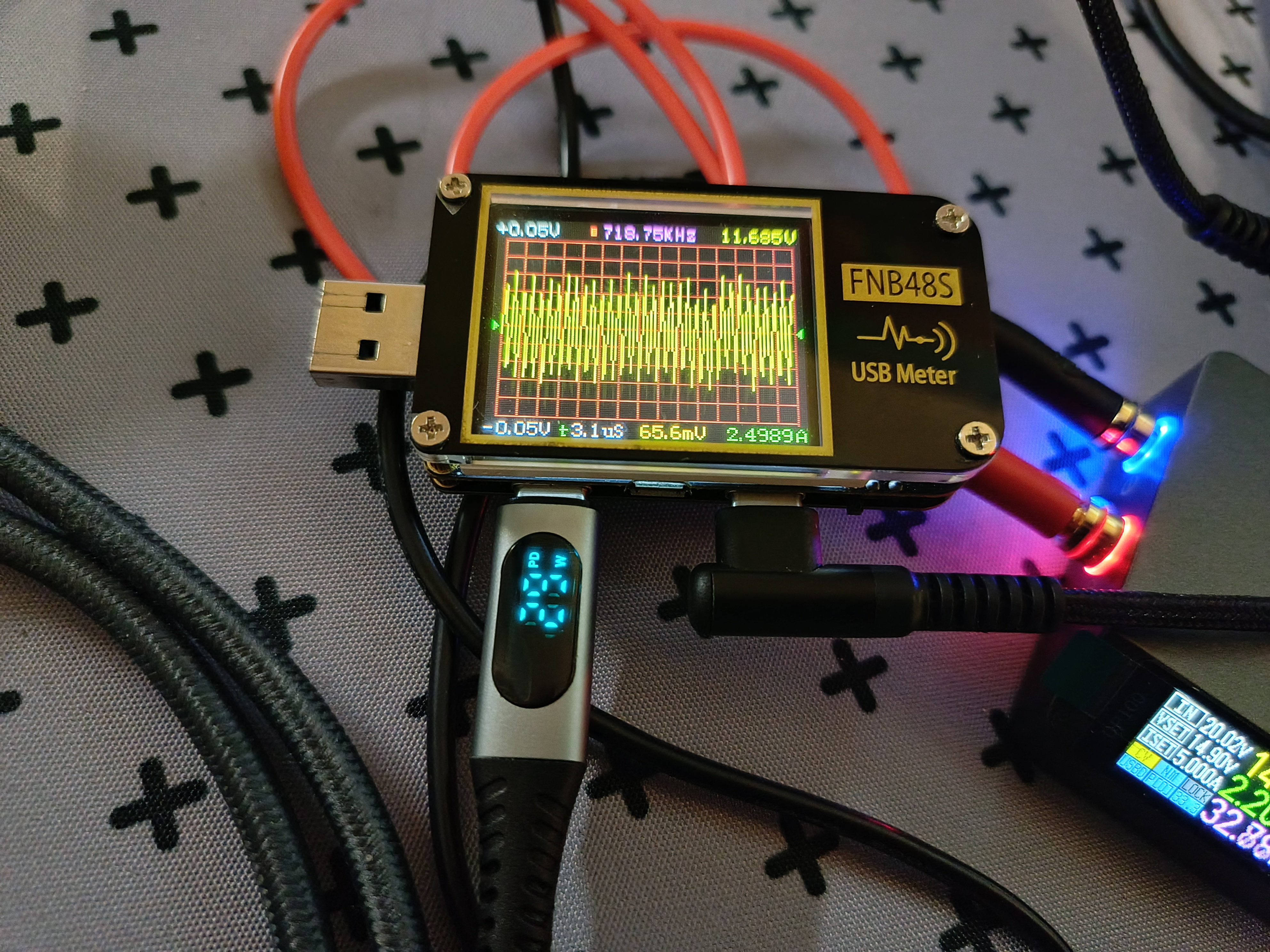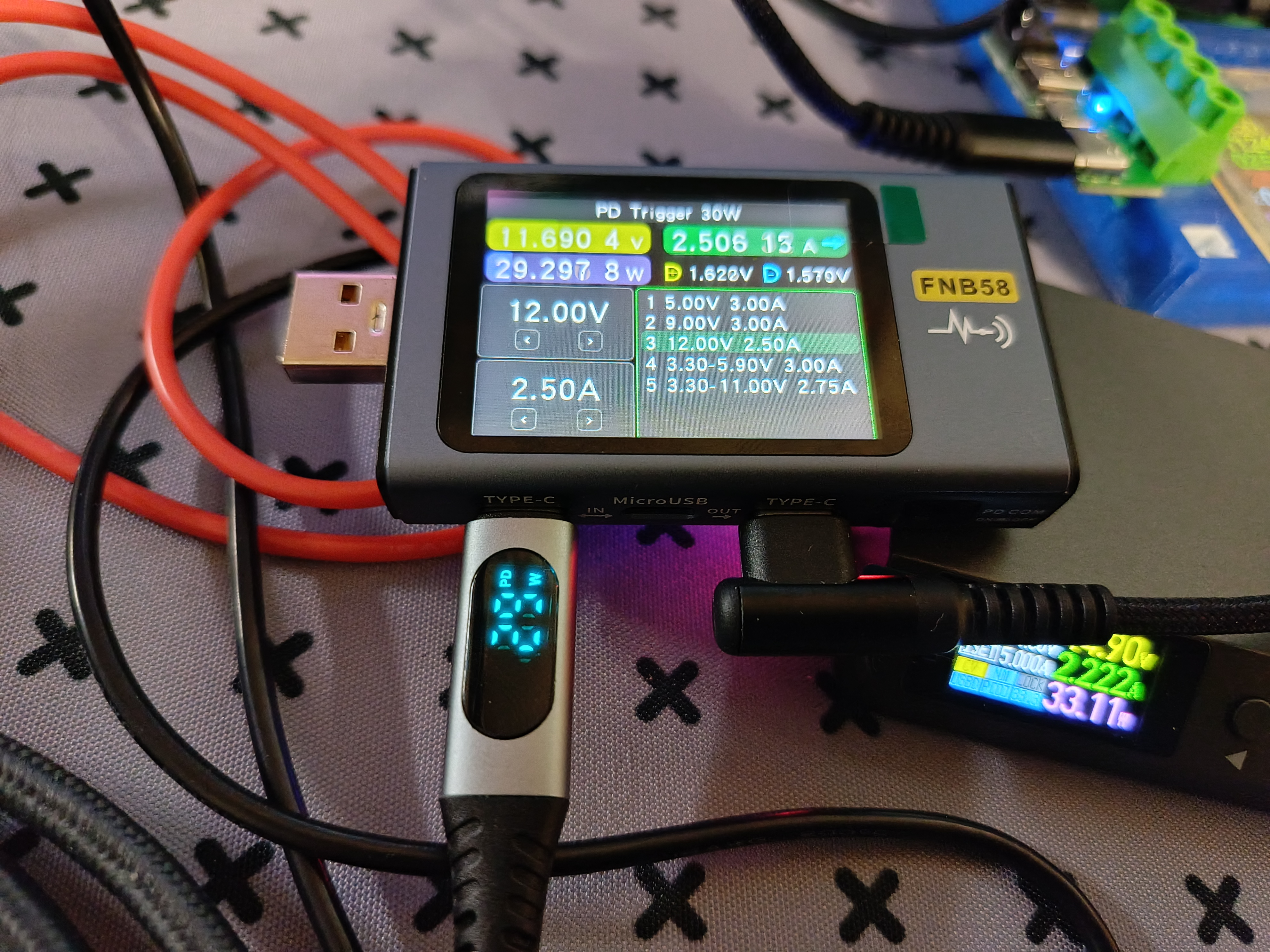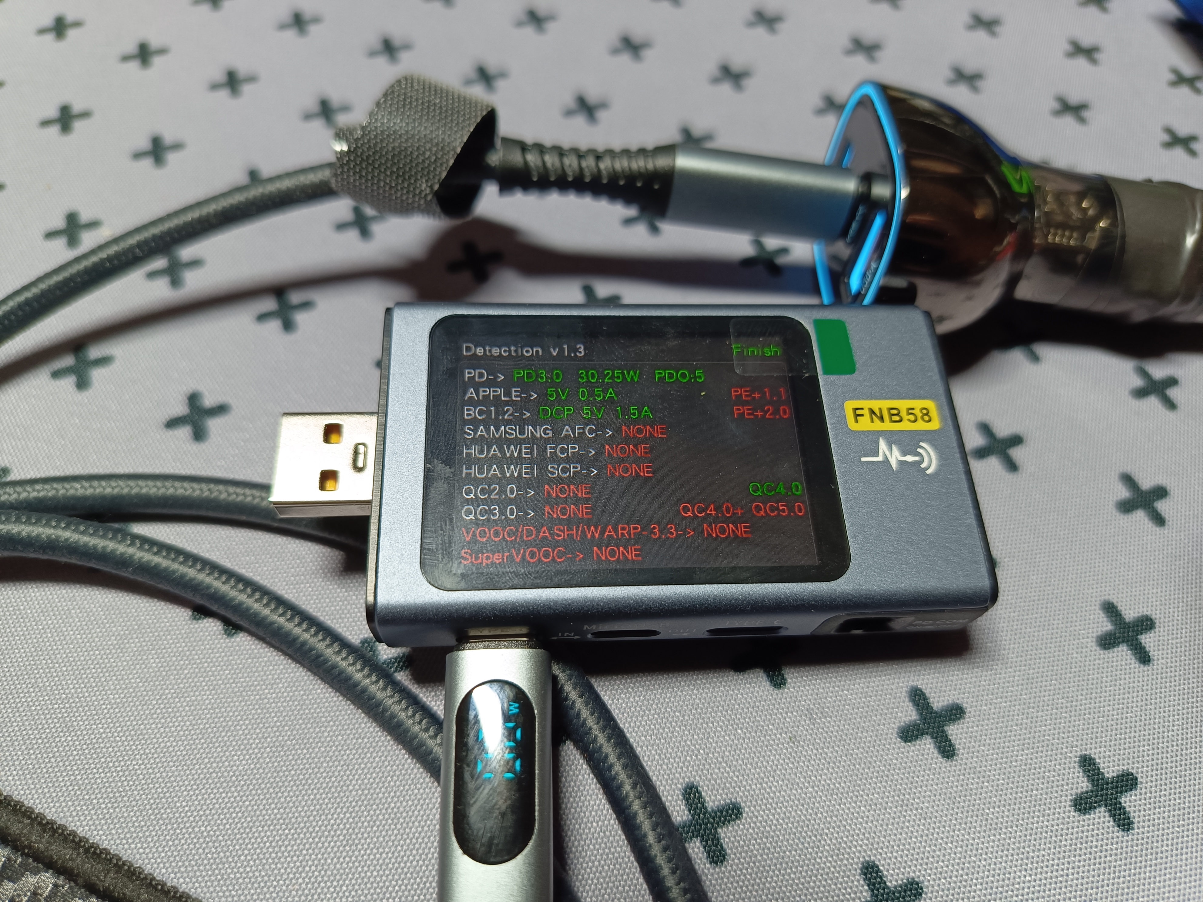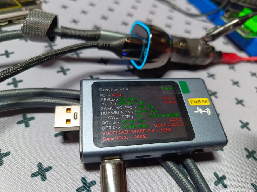 Обозреваемая зарядка подразумевает использование протоколов быстрой зарядки на каждом разъеме. Собрав импровизированный стенд, я приступил к тестированию. Ниже в предоставленных таблицах можете посмотреть все доступные протоколы, которые определил USB-тестер.