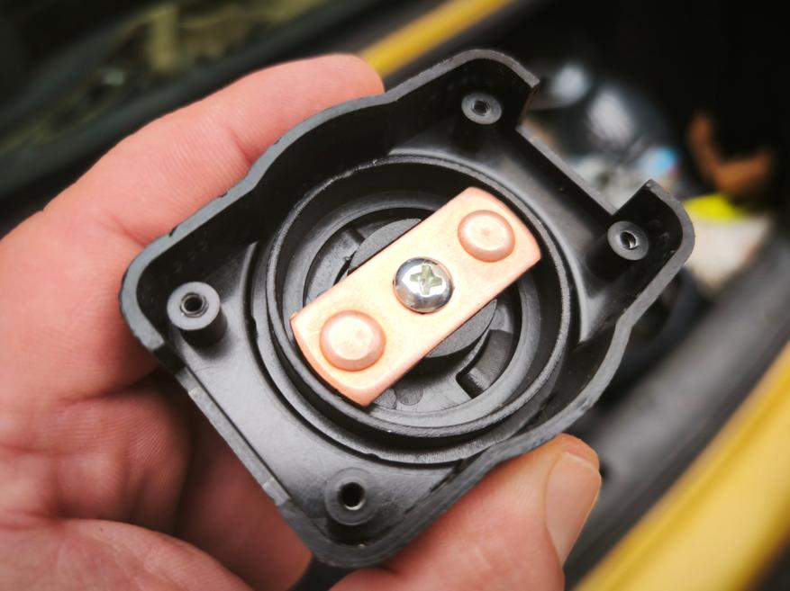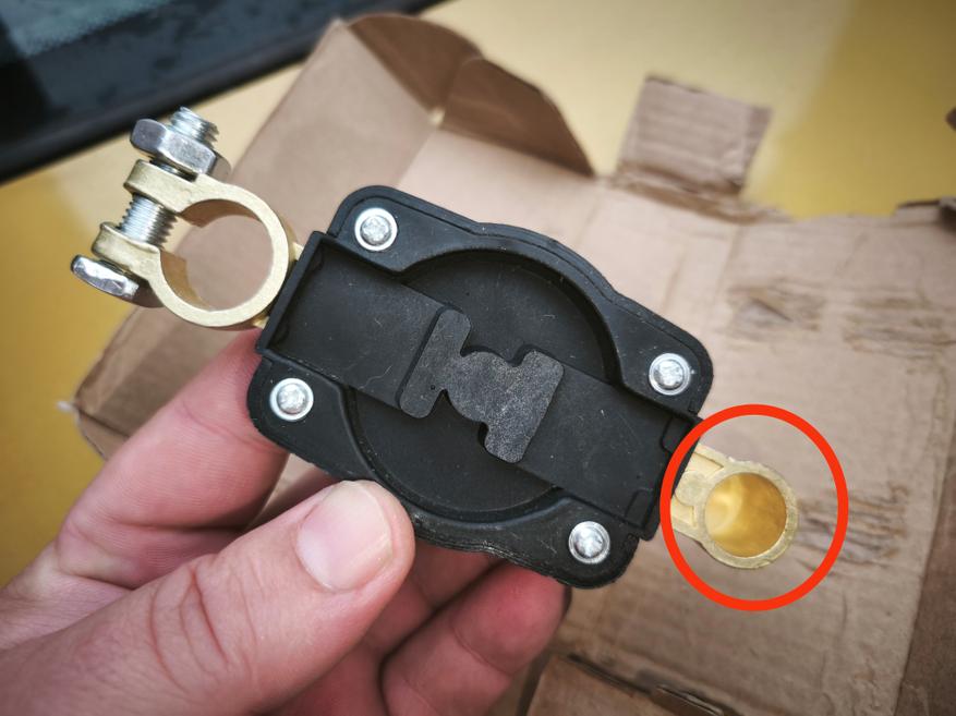 Обратите внимание, что клемма «папа» внутри полая. Это может иметь для вас значение, если пусковой ток вашего автомобиля очень большой. В таком случае вам нужно будет искать отсекатель с более толстыми контактами. В моем случае устройство устанавливалось на легковой автомобиль, поэтому для себя в этом плане я проблемы не заметил.