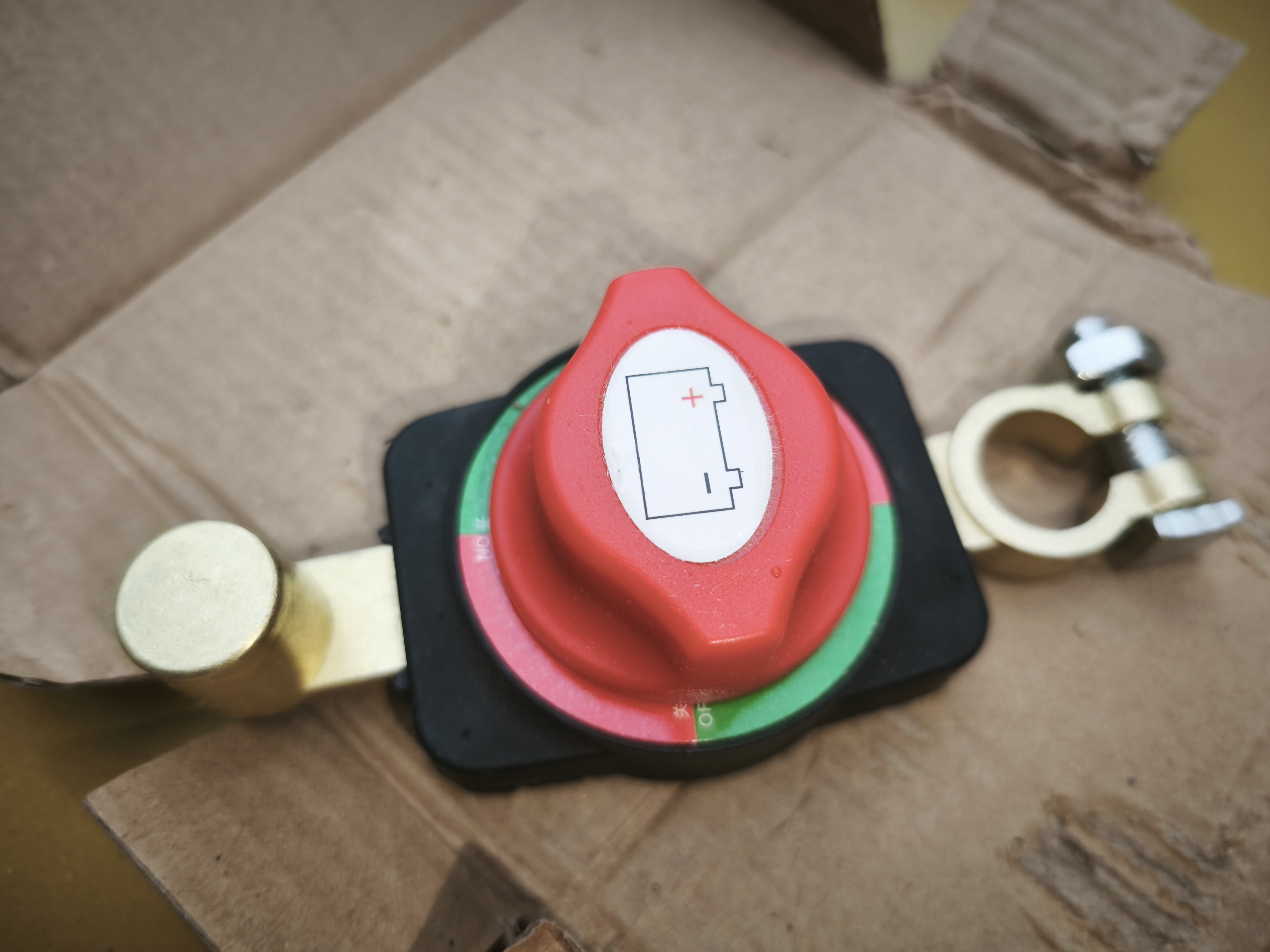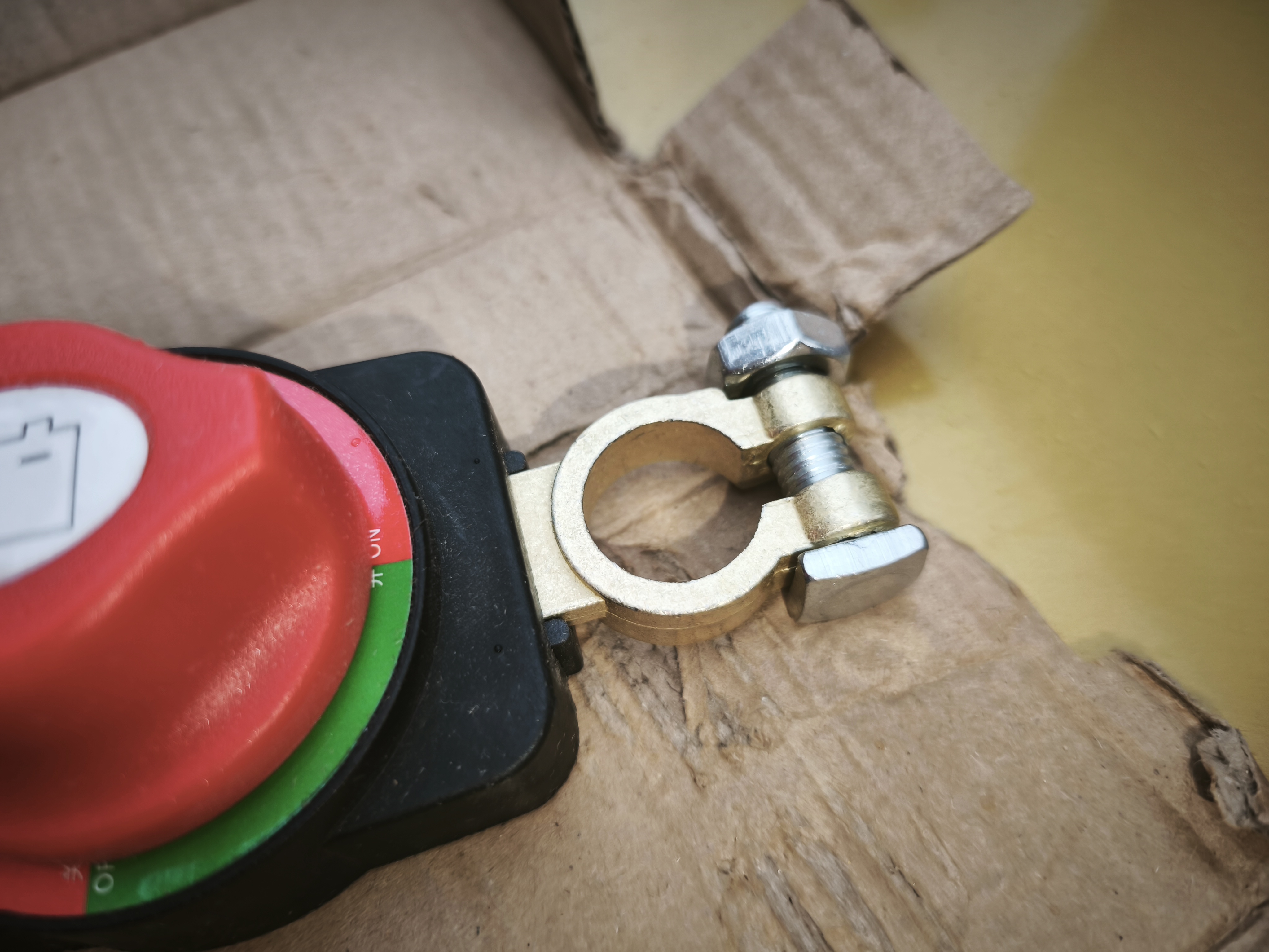Итак, устройство приходит в обычной картонной коробке, будьте внимательны, так как при заказе можно выбрать один из вариантов компоновки клемм. Это важно, так как в зависимости от конфигурации автомобиля, вам может подойти тот или иной вариант конструкции отсекателя. В моем случае мне подошёл классический вариант с клеммой «мамой» для фиксации на аккумуляторе и клеммой «папой» для подключения минусового провода электросети автомобиля.