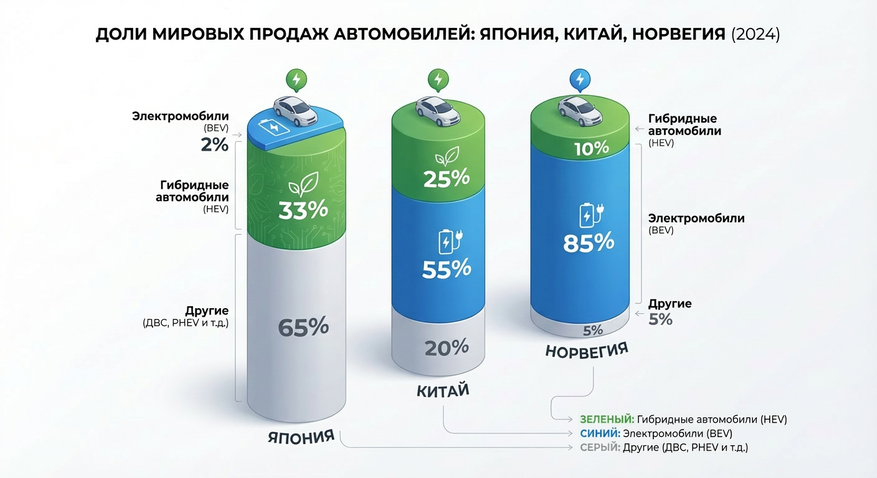 Контраст впечатляет. В 2025 году доля гибридов на японском рынке держится на уровне 33-35%, а электрокары застряли на отметке 2%. Разница — в 16-17 раз. Для сравнения: в Китае электрокары захватили 49% продаж, в Норвегии — 54%, даже в США — около 10%.