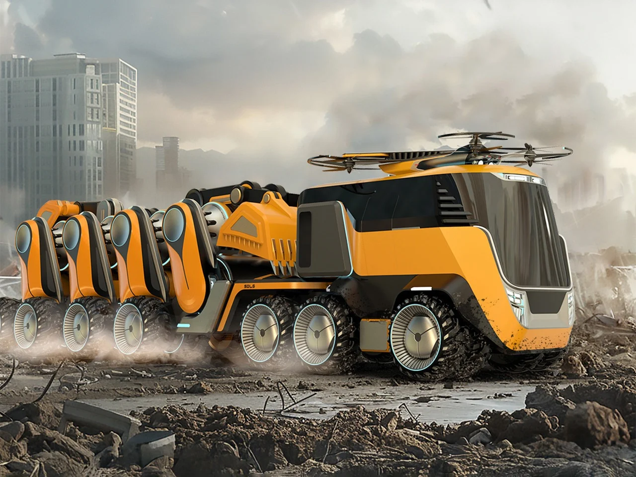 В крышу кабины встроена стартовая платформа для беспилотника. Дрон поднимается в воздух первым и проводит аэрофотосъемку местности, передавая данные о рельефе и грунте в командный центр в режиме реального времени. На основе этих данных искусственный интеллект корректирует действия наземных модулей.