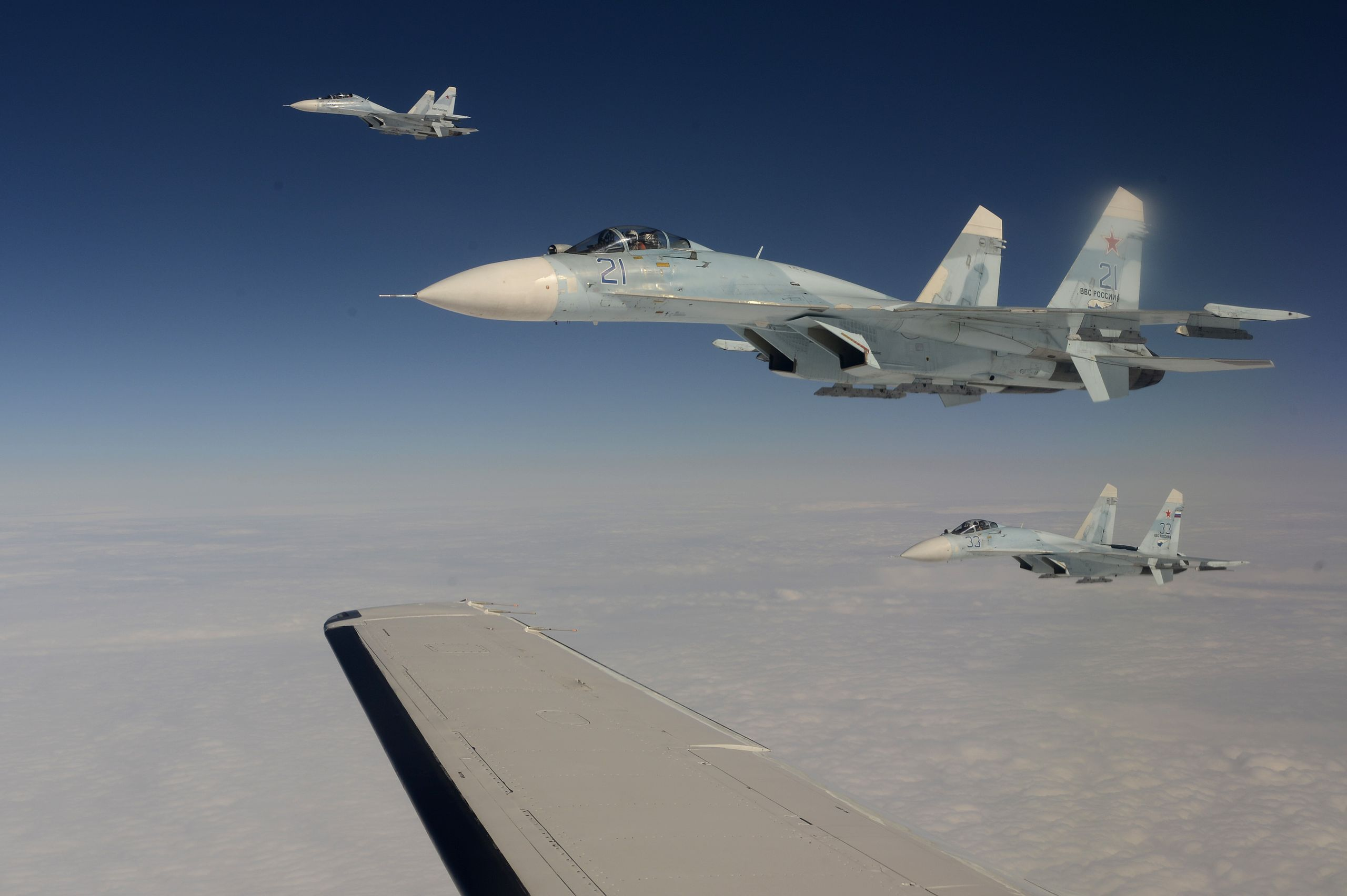 Еще одной характерной чертой советских истребителей, таких как Су-27 и его последующие модификации (Су-30, Су-35), является низкое расположение двигателей. Такая конструкция требует большого объема забора воздуха для эффективной работы двигателей. Воздушный поток направляется под «брюхо» самолета и попадает в воздухозаборники, обеспечивая оптимальную работу силовых установок. Расширение внутреннего объёма летательного аппарата из-за изгиба даёт возможность разместить более ёмкие топливные резервуары и современную электронную аппаратуру. Изогнутый корпус способствует оптимальному распределению массы вокруг центра тяжести, а компактные размеры стабилизаторов и рулей повышают управляемость. Так, в Су-27 гармоничное соединение крыла с фюзеляжем формирует единую конструкцию, завершающуюся двухкилевым хвостовым оперением.