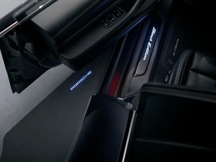 Салон автомобилей получил черный пакет отделки, матовые накладки на пороги с подсветкой и дополнительные отсеки для хранения. На центральной консоли размещен эксклюзивный шильдик «Black Edition». Комфортные сиденья с 14-позиционной электрорегулировкой и функцией памяти дополнены вышитыми гербами Porsche на подголовниках.