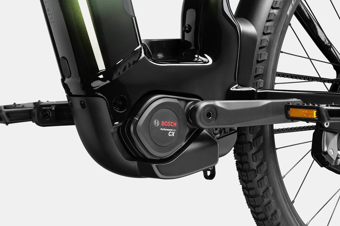 Аккумулятор Bosch PowerTube емкостью 800 Вт*ч входит в стандартную комплектацию и встроен в нисходящую трубу Automatiq. В конструкции используется двигатель Bosch Performance Line CX 250 Вт 2025, которая является самым современным агрегатом этой марки. Двигатель максимально выдает 85 Н*м и 600 Вт, а в сочетании с интеллектуальной системой, аккумулятором и парой покрышек для пересеченной местности максимальная дальность хода составляет 185 км на одной зарядке (работает в режиме Eco+).