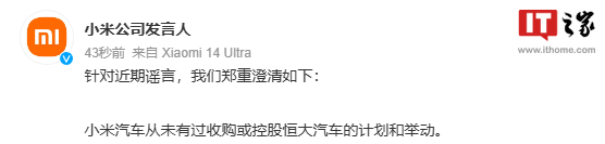 Официальный представитель компании Xiaomi опубликовал сегодня заявление, в котором говорится, что «в ответ на недавние слухи мы разъясняем, что у Xiaomi Automobile никогда не было планов или действий по приобретению или контролю над Evergrande Automobile».
