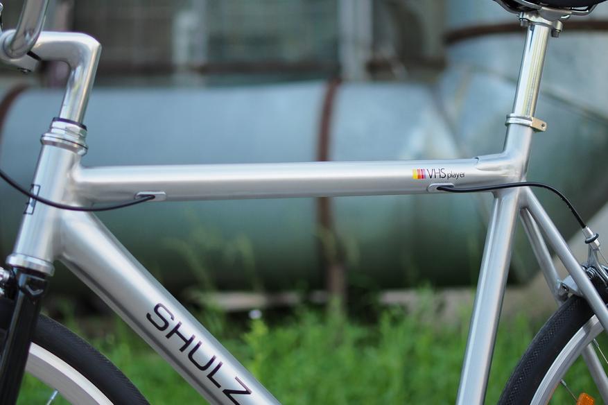 Дизайн — определенно то, что выделяет VHS Player. В 2024 году Shulz выкрутил на максимум любовь к полированному алюминию, что отлично видно в том числе по герою обзора. Сама рама — не окрашенная, к ней прибавляются сверкающие обода, вынос и прочие элементы. Смотрится весь этот ансамбль отлично и хорошо сочетается с черной вилкой и покрышками.