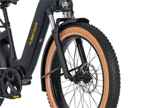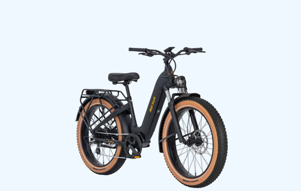 Big Sur отличается толстыми шинами 26″ x 4″, обладающими защитой от проколов. Шины одеты на алюминиевые диски с черными спицами 12 g/ 2,6 мм (материал нержавеющая сталь). Транспорт спроектирован таким образом, чтобы выдерживать нагрузку 400 фунтов/181 кг (включает вес водителя и грузы на заднем багажнике). Багажник предлагает стандарт крепления MIK. Цена — 2399 долларов США.