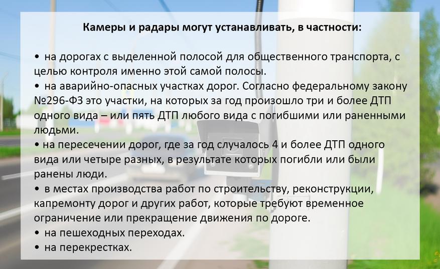 Также следует отметить, что опять же в соответствии с законом камеры и радары несут не карательную, а предупредительную функцию. То есть, их задача — не собирать штрафы и пополнять областной бюджет, а снижать аварийность на тех или иных участках. Собственно, вот для наглядности требования к местам установки комплексов, которые вступили в силу с 1 сентября 2024 года.