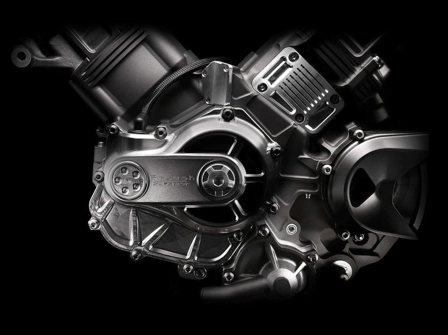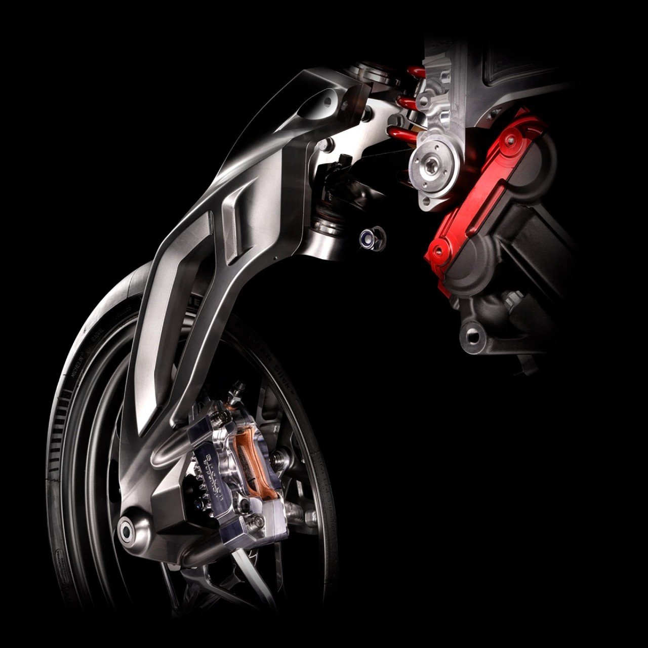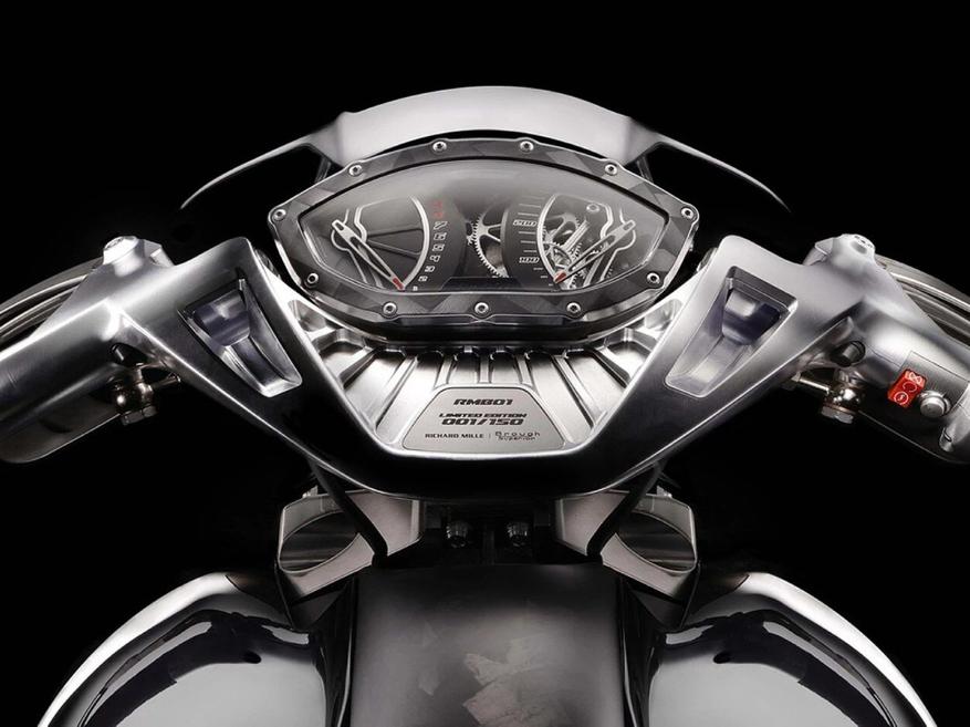 Приборная панель мотоцикла оснащена механическим спидометром, выполненным в стиле часов Richard Mille. Аэродинамический обвес имеет матовое покрытие антрацитово-серого цвета с элементами светло-серого оттенка. Синие акценты присутствуют на крышках головок цилиндров, главном цилиндре сцепления, крышке генератора и пружинах амортизаторов.
