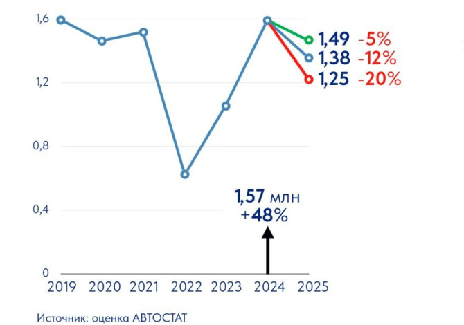 Прогнозируя развитие ситуации на вторую половину 2025 года, необходимо учитывать комплекс факторов, влияющих на динамику рынка. Согласно данным агентства «АВТОСТАТ», даже при оптимистичном сценарии объем рынка новых легковых автомобилей не превысит 1,49 млн единиц, что означает снижение на 5% по сравнению с предыдущим годом. Базовый сценарий предполагает более существенное падение — до 1,38 млн автомобилей (-12%), а пессимистичный — до 1,25 млн (-20%).
