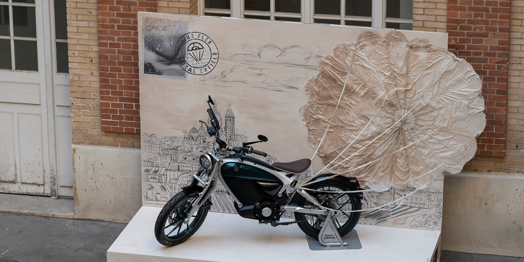 Центральным элементом экспозиции стала инсталляция с оригинальным парашютом 1940-х годов, созданная студенткой-дизайнером Сарой Буиссу. Инсталляция символически связала историческое наследие бренда с современностью — во время Второй мировой войны мотоциклы Flying Flea сбрасывались с парашютами для обеспечения мобильности солдат.