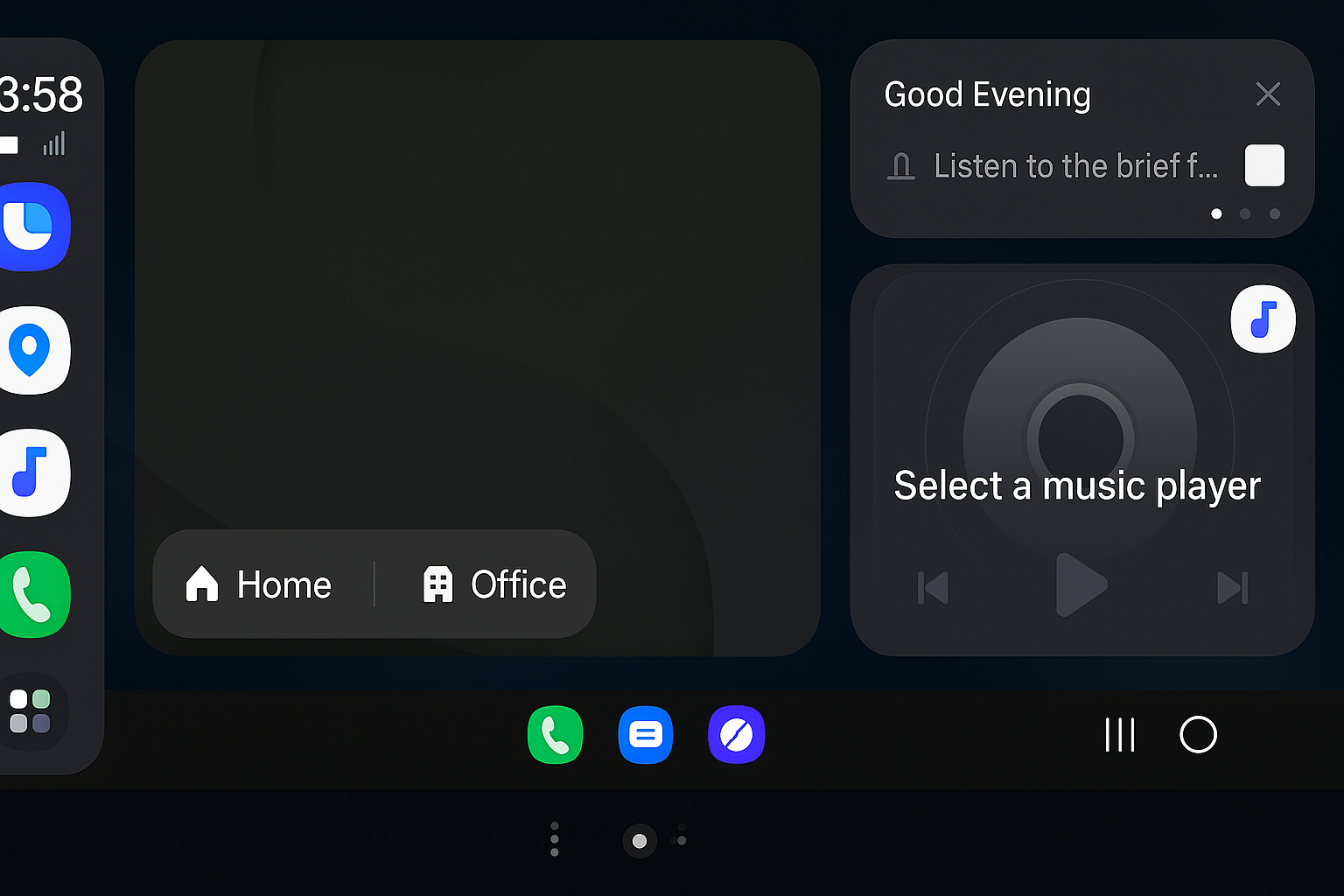 Судя по предоставленным скриншотам, интерфейс Auto DeX имеет структуру, схожую с Android Auto или Apple CarPlay. Приложение с картами расположено по центру экрана. Ярлык плейлиста находится в правом верхнем углу, а под ним — панель управления музыкой.