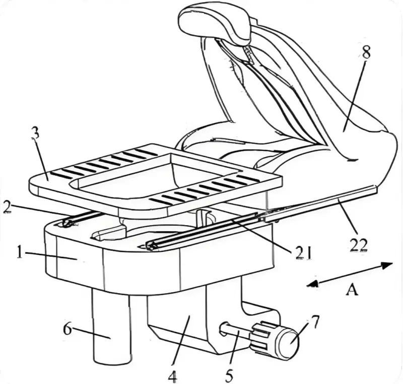 Запатентованная конструкция представляет собой унитаз, который прячется под сиденьем автомобиля. Устройство состоит из корпуса и раздвижной направляющей системы. Направляющая включает фиксированную часть на корпусе унитаза и подвижную часть, закрепленную к сиденью. Унитаз выдвигается из-под сиденья при использовании и задвигается обратно в нерабочем состоянии.