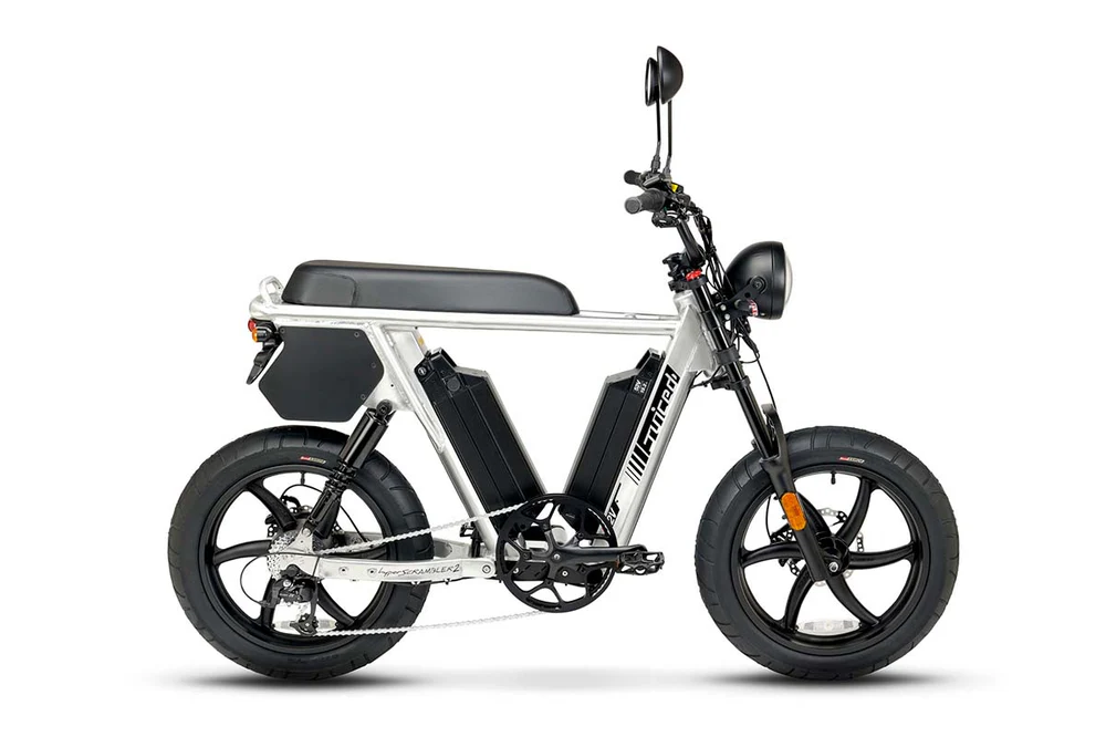 Велосипед построен на открытой раме из алюминиевого сплава, выполненной в стиле мопеда. Компания Juiced разработала HyperScrambler 2 с возможным оборудованием его двумя аккумуляторами более 1600 Вт*ч суммарно и оснастила его мотором Bafang мощностью 1000 Вт в сочетании с датчиками крутящего момента и частоты вращения. Максимальный запас хода составляет до 100 миль/160 км. Аккумуляторам требуется семь часов на зарядку.