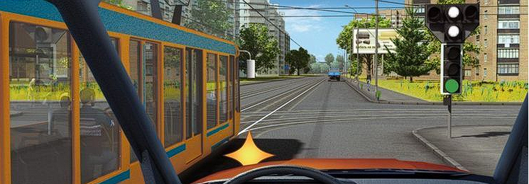 - Пропустим трамвай, перестроимся на пути, и выполним поворот с них.