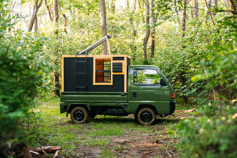 Дизайнер необычного компактного жилья Леви Келли из США, показал на видео youtube.com свой вариант самого маленького дома на колесах. Проект кемпера реализован на кузове японского грузовика 4х4 Honda Acty (1998 года выпуска) на площади чуть меньше двух квадратных метров. При этом в доме на колесах есть спальное место, туалет, раковина, душ и камин.