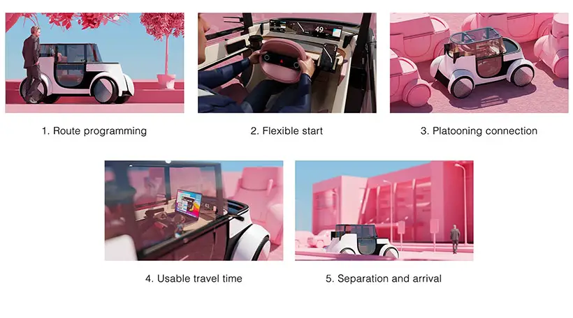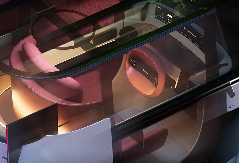 Ключевая особенность концепта — интерьер, спроектированный по принципам жилого пространства, а не традиционного автомобильного салона. Внутреннее пространство трансформируется в зависимости от потребностей пользователя: от уютного места для отдыха до компактного рабочего кабинета. Дизайн интерьера разработан с акцентом на комфорт, атмосферу и качественные материалы, что отражает экспертизу Vitra в области мебельного дизайна.