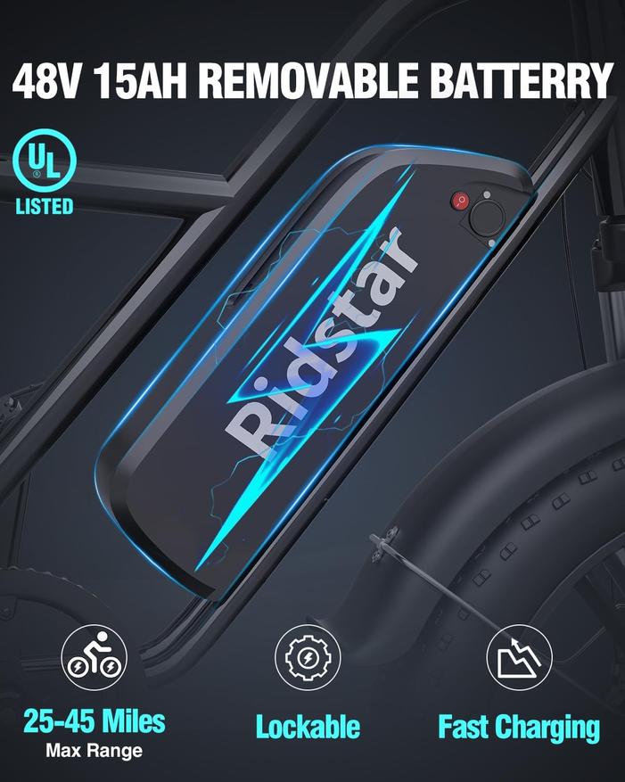 Электровелосипед предлагает три режима езды: чисто электрический, с электроприводом и на педалях. Он оснащен съемным 48 Вольт 15 А*ч аккумулятором, обеспечивающим запас хода без перезарядки до 30 миль/48,2 км в полностью электрическом режиме и до 50 миль/80,4 км в режиме помощи при нажатии педалей. Аккумулятор оснащен системой защиты BMS и функциями энергосбережения. Время зарядки аккумулятора составляет 4-6 часов при зарядном токе 3 А.