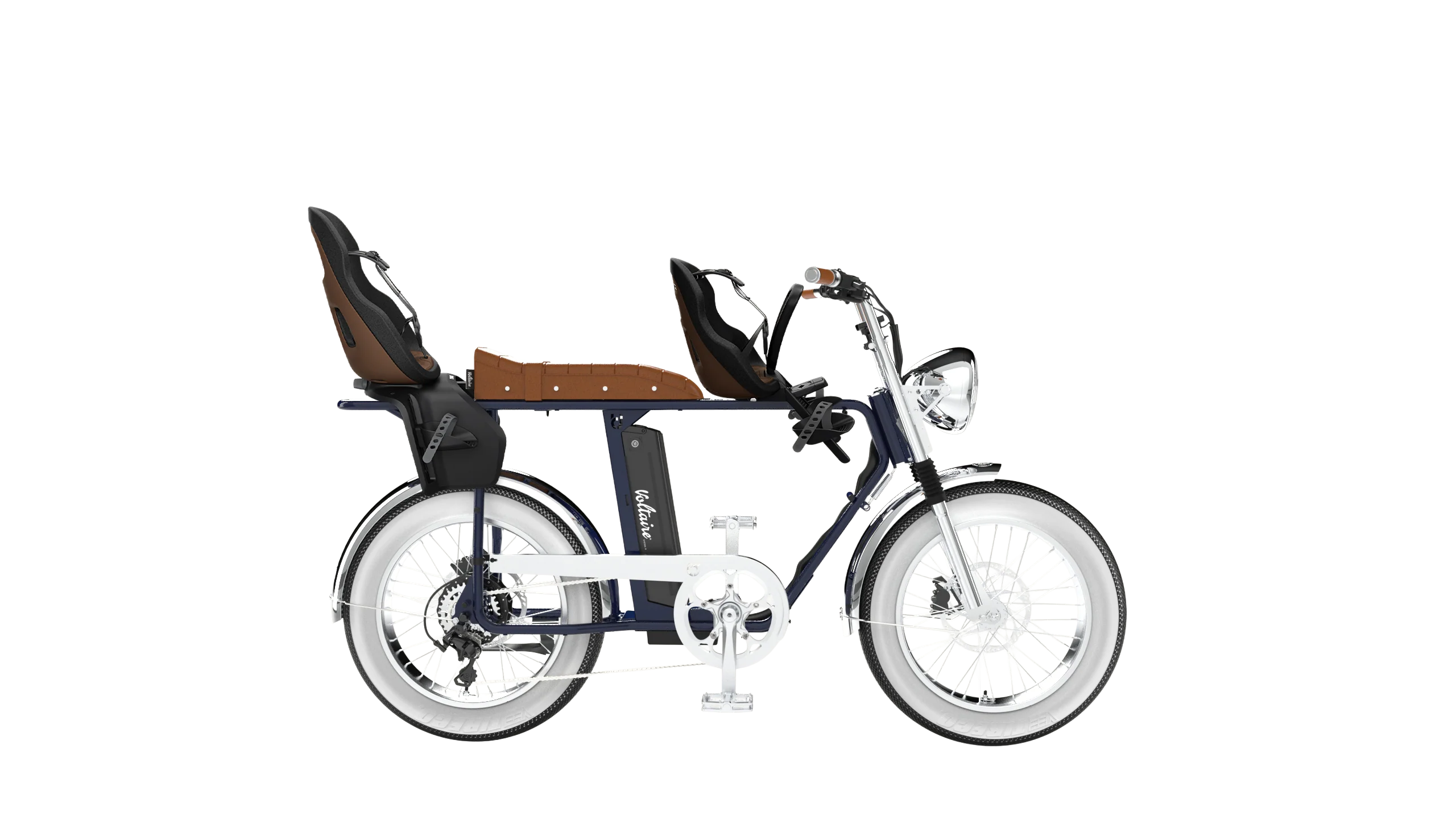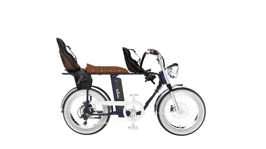 Paname — это электрический фэтбайк c шинами размером 20*4 дюйма и способный перевозить 1 или 2 пассажиров благодаря модульному седлу, предлагаемому в нескольких размерах: длинном или компактном, что позволяет разместить перед собой маленького ребенка. Бренд придал модели мопедный вид благодаря конструкции рамы, толстым шинам, вилке передней подвески и дизайну передней фары.