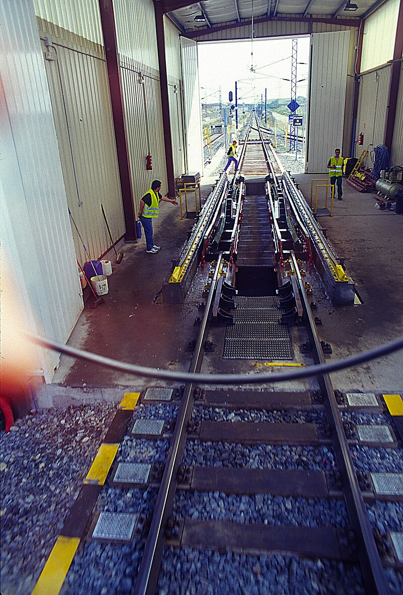 Трансбордажная технология представляет собой другое техническое решение, позволяющее осуществлять автоматическую корректировку ширины колесных пар подвижного состава. Принцип работы основан на механизме принудительного поперечного перемещения отдельных элементов колесной базы. Ключевая особенность системы заключается в том, что процесс происходит без остановки движения состава, на пониженной скорости (15-20 км/ч), в полностью автоматическом режиме, без участия персонала.