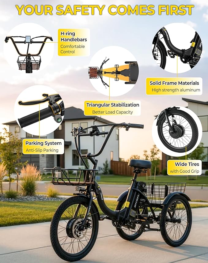Устойчивость на трех колесах (размер 20 дюймов, вседорожные покрышки) благодаря заднему дифференциалу обеспечивает плавные контролируемые повороты. Вместительная задняя корзина, передняя корзина и задняя стойка обеспечивают достаточную грузоподъемность.