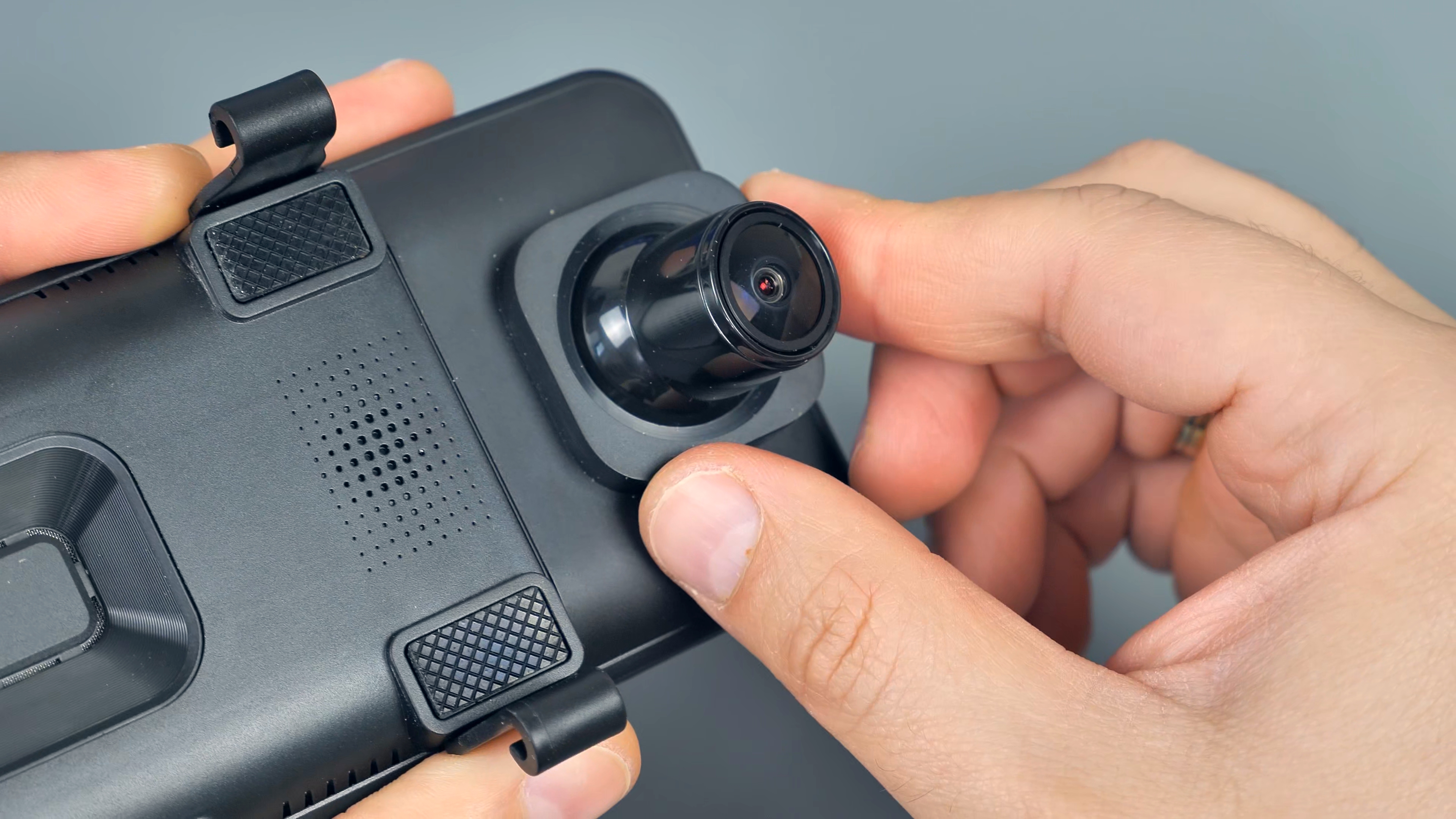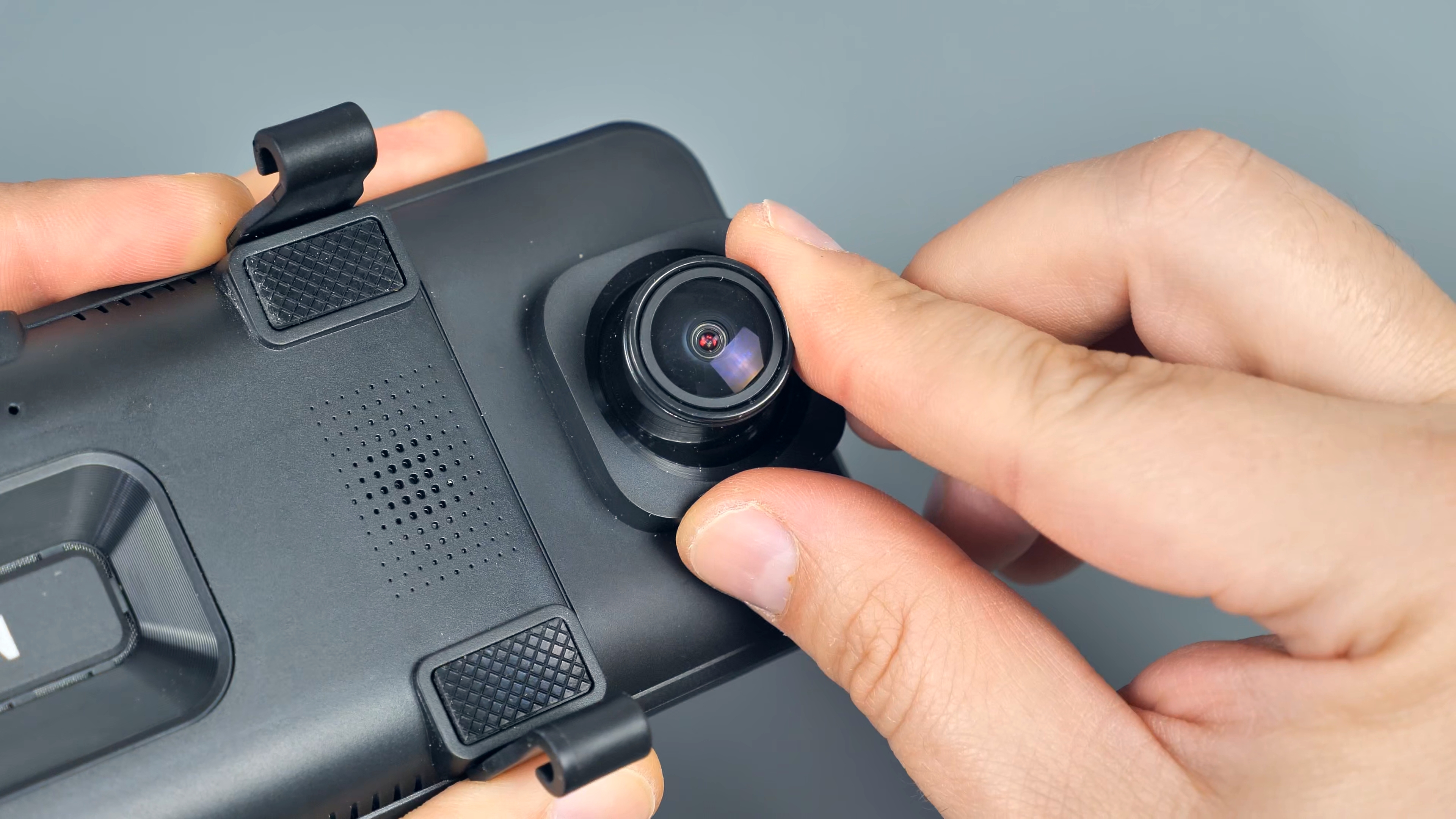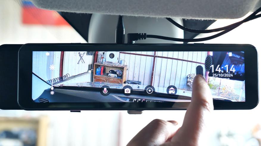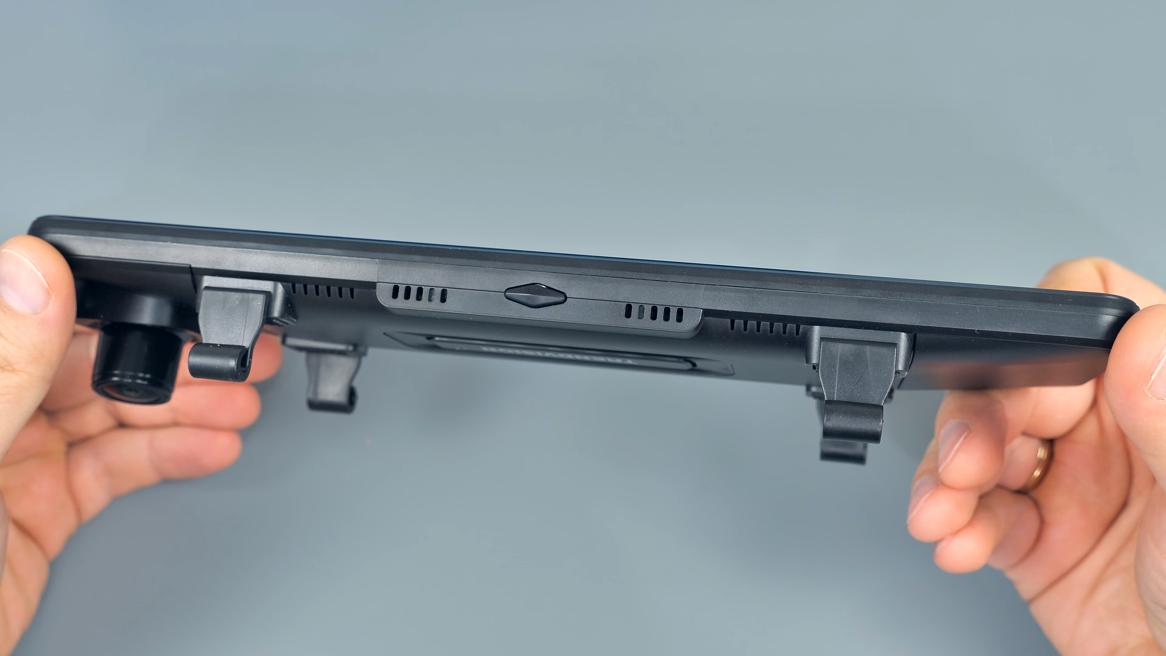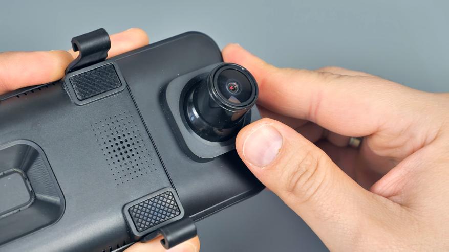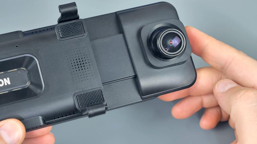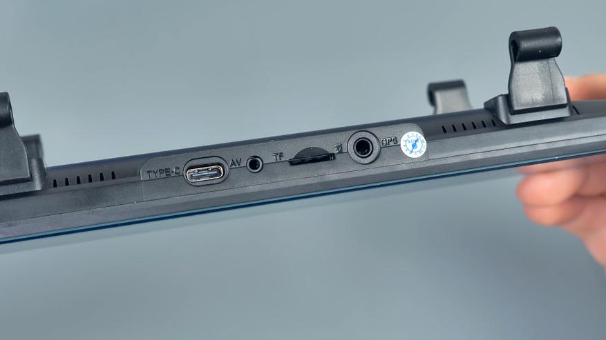 На нижней части корпуса расположились кнопка включения/выключения устройства и микрофон. На верхней части USB Type-C порт питания, разъём для подключения задней камеры, слот для Micro SD карты памяти объёмом до 128Гб и разъём для подключения внешней GPS антенны, которая по умолчанию в комплект не входит. На передней части расположены динамики, кнопка сброса параметров и крепления для фиксации данного зеркала на штатном зеркале автомобиля. Также тут находится блок камеры, который имеет сдвижной механизм.