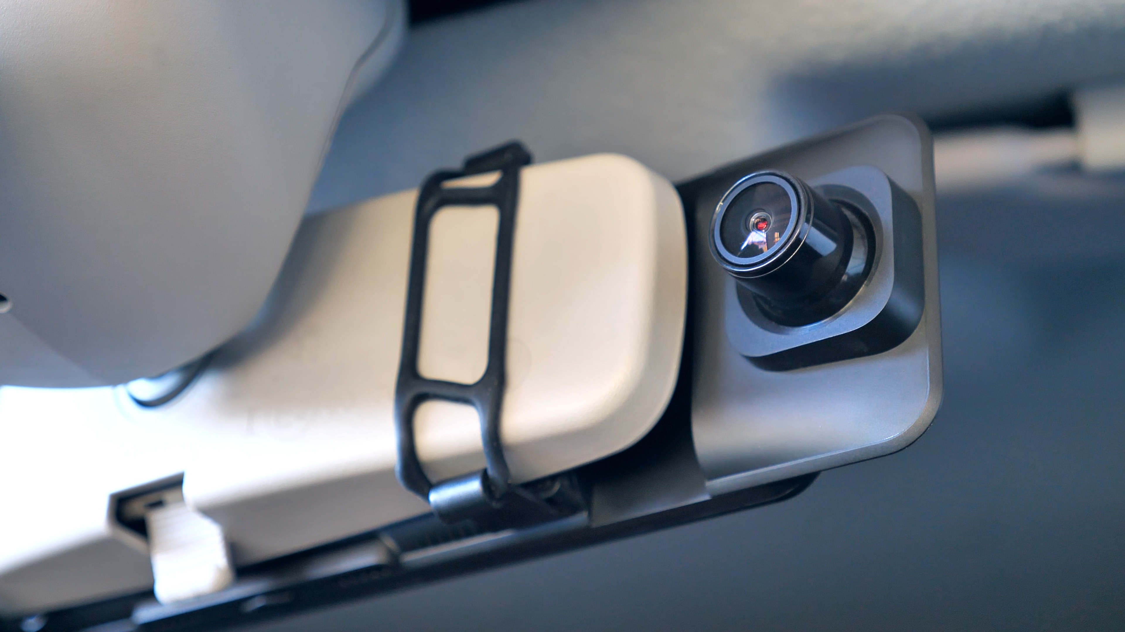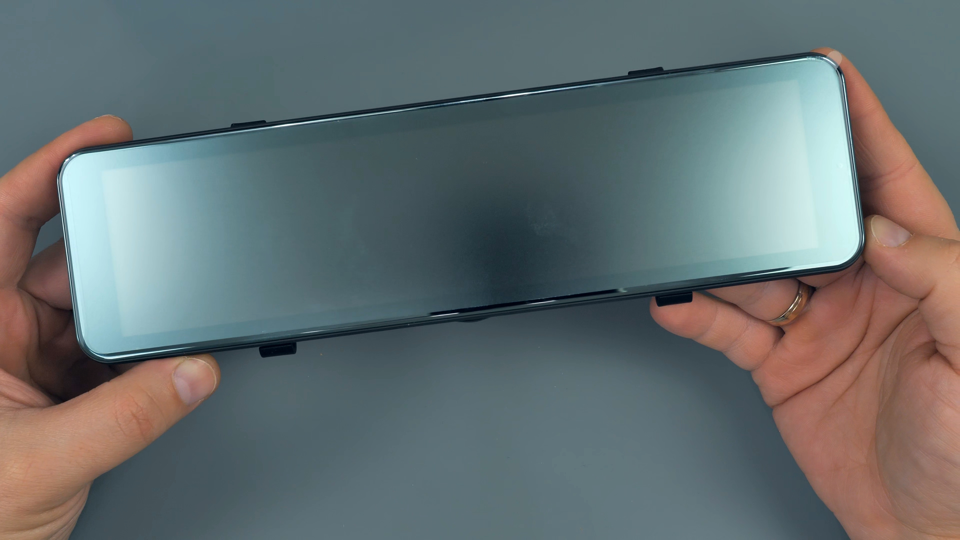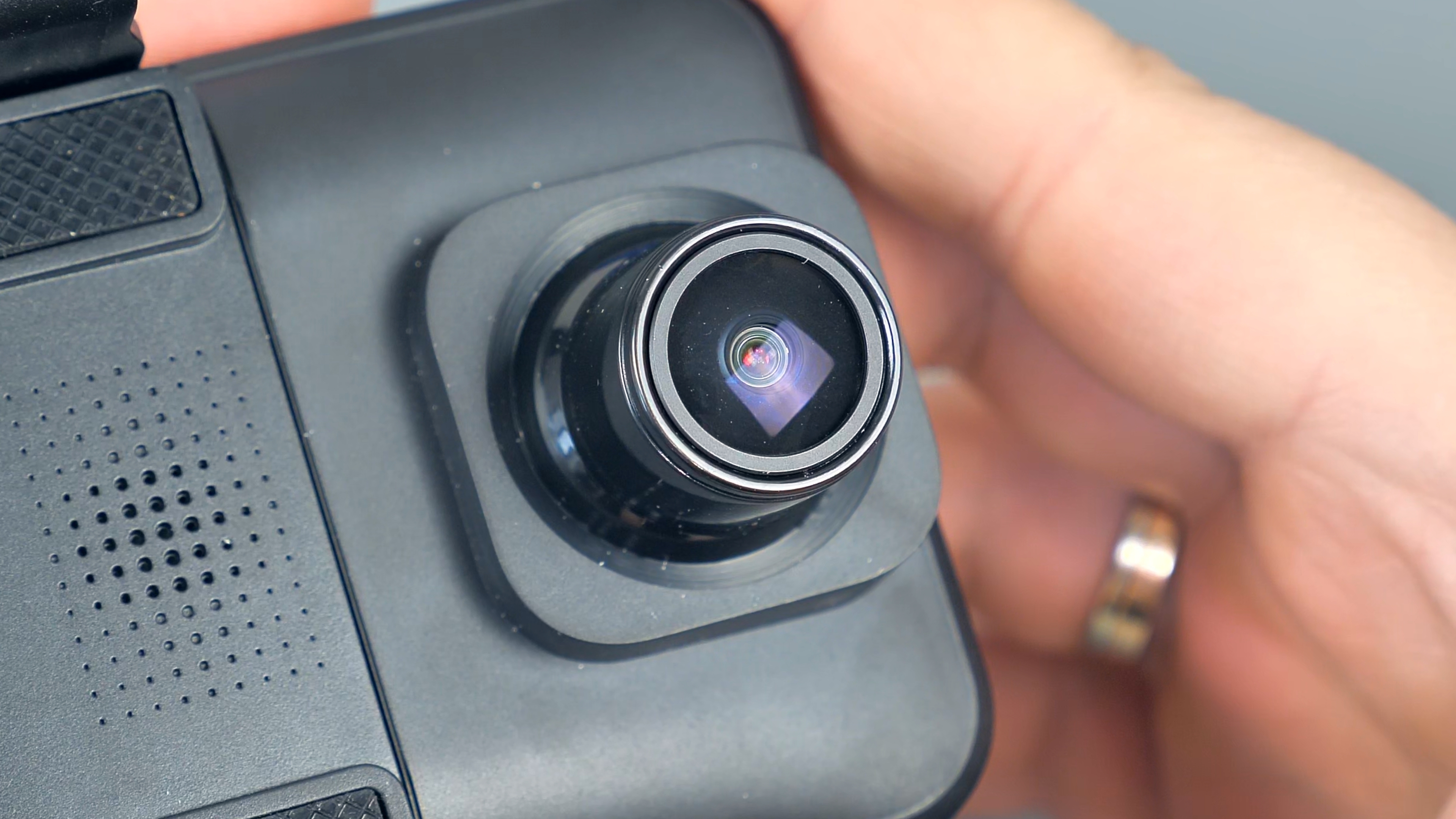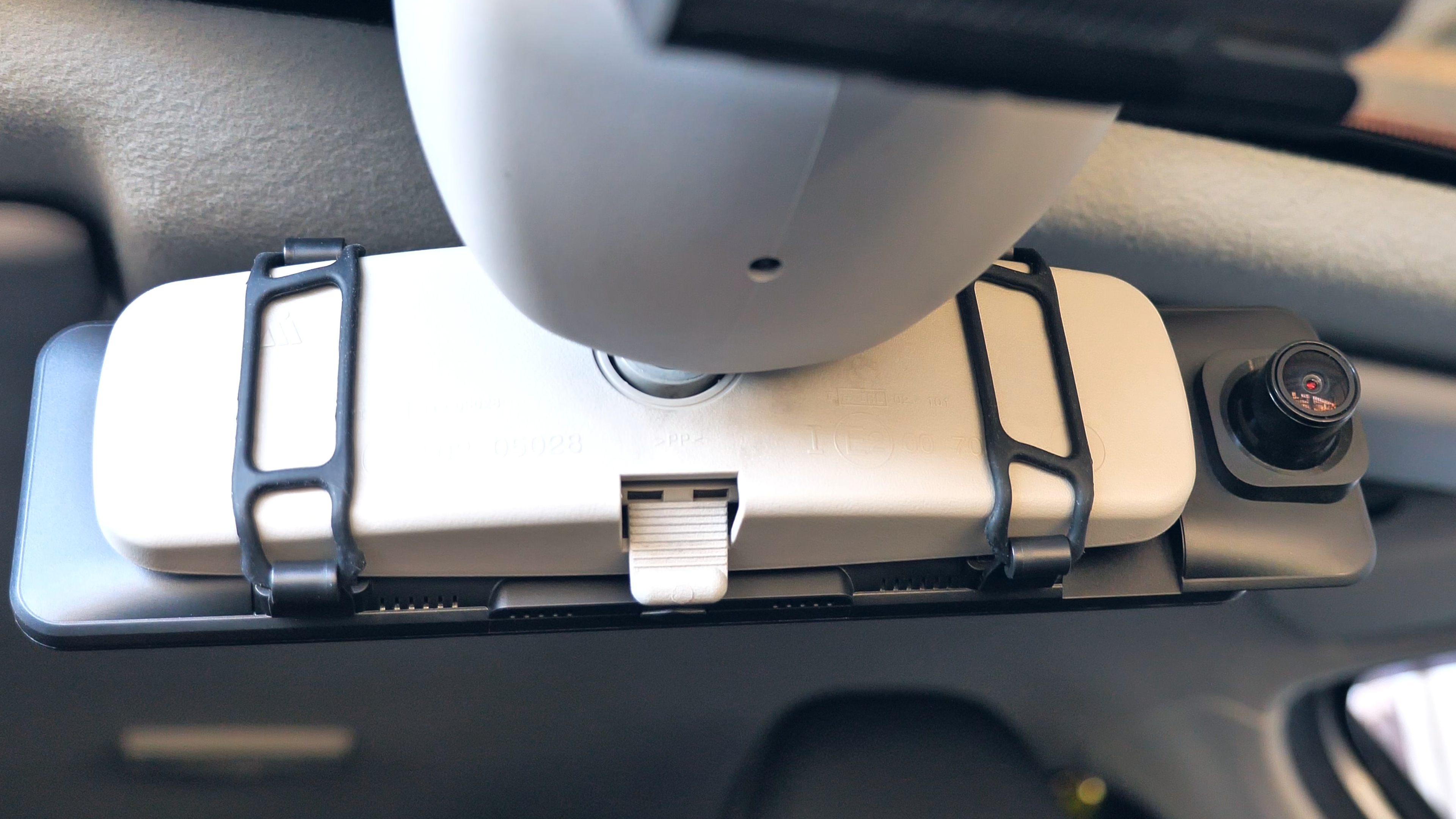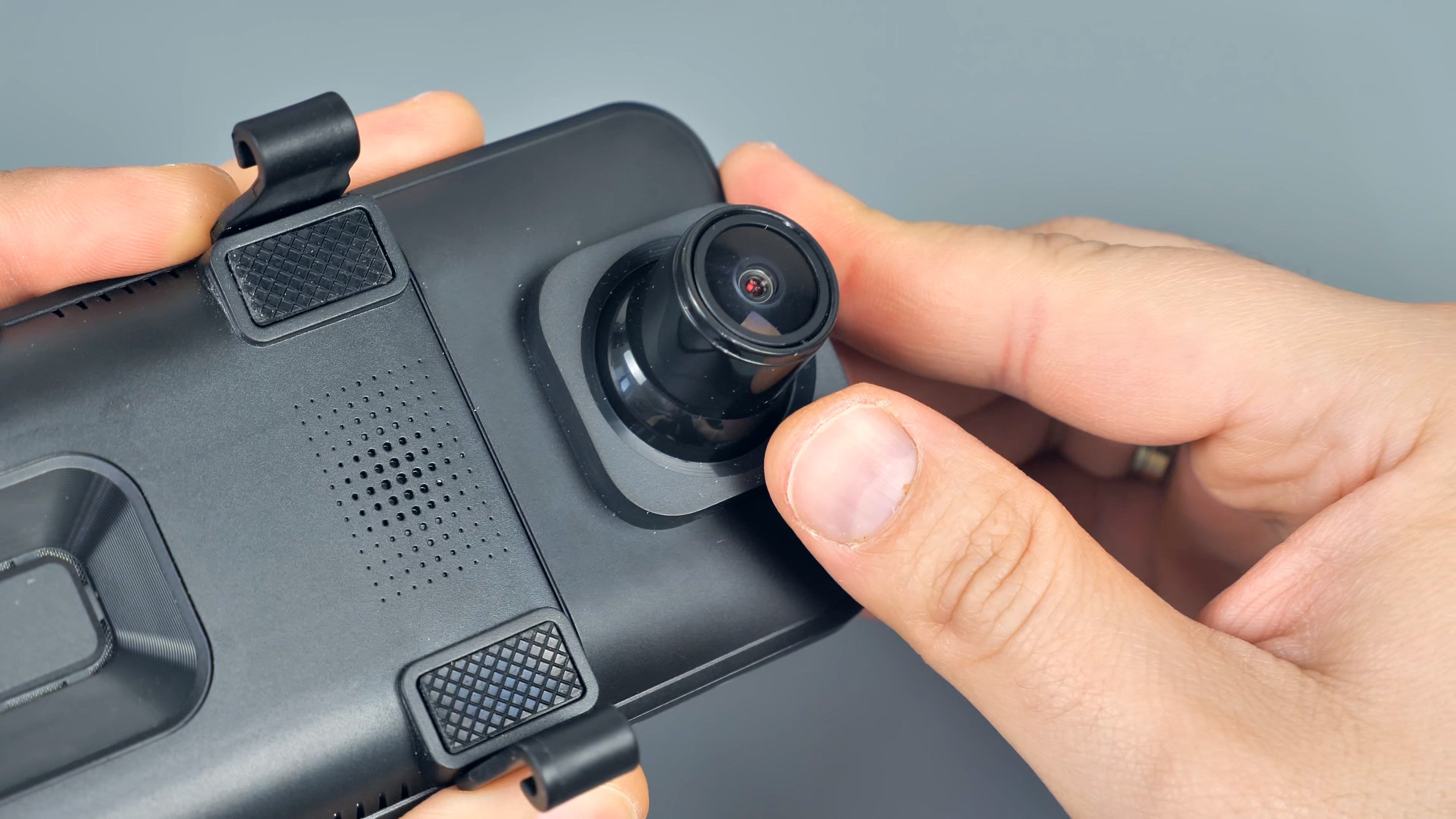 На нижней части корпуса расположились кнопка включения/выключения устройства и микрофон. На верхней части USB Type-C порт питания, разъём для подключения задней камеры, слот для Micro SD карты памяти объёмом до 128Гб и разъём для подключения внешней GPS антенны, которая по умолчанию в комплект не входит. На передней части расположены динамики, кнопка сброса параметров и крепления для фиксации данного зеркала на штатном зеркале автомобиля. Также тут находится блок камеры, который имеет сдвижной механизм.