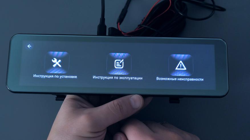 Также на смарт-экране есть раздел помощи, в котором представлены инструкция по установке зеркала в автомобиле, инструкция пользователя, если в чём-то не получается разобраться и даже решения по основным возможным неисправностям. Конечно же есть возможность зайти в галерею на карте памяти для просмотра фото и видеозаписей как с передней, так и с задней камеры.