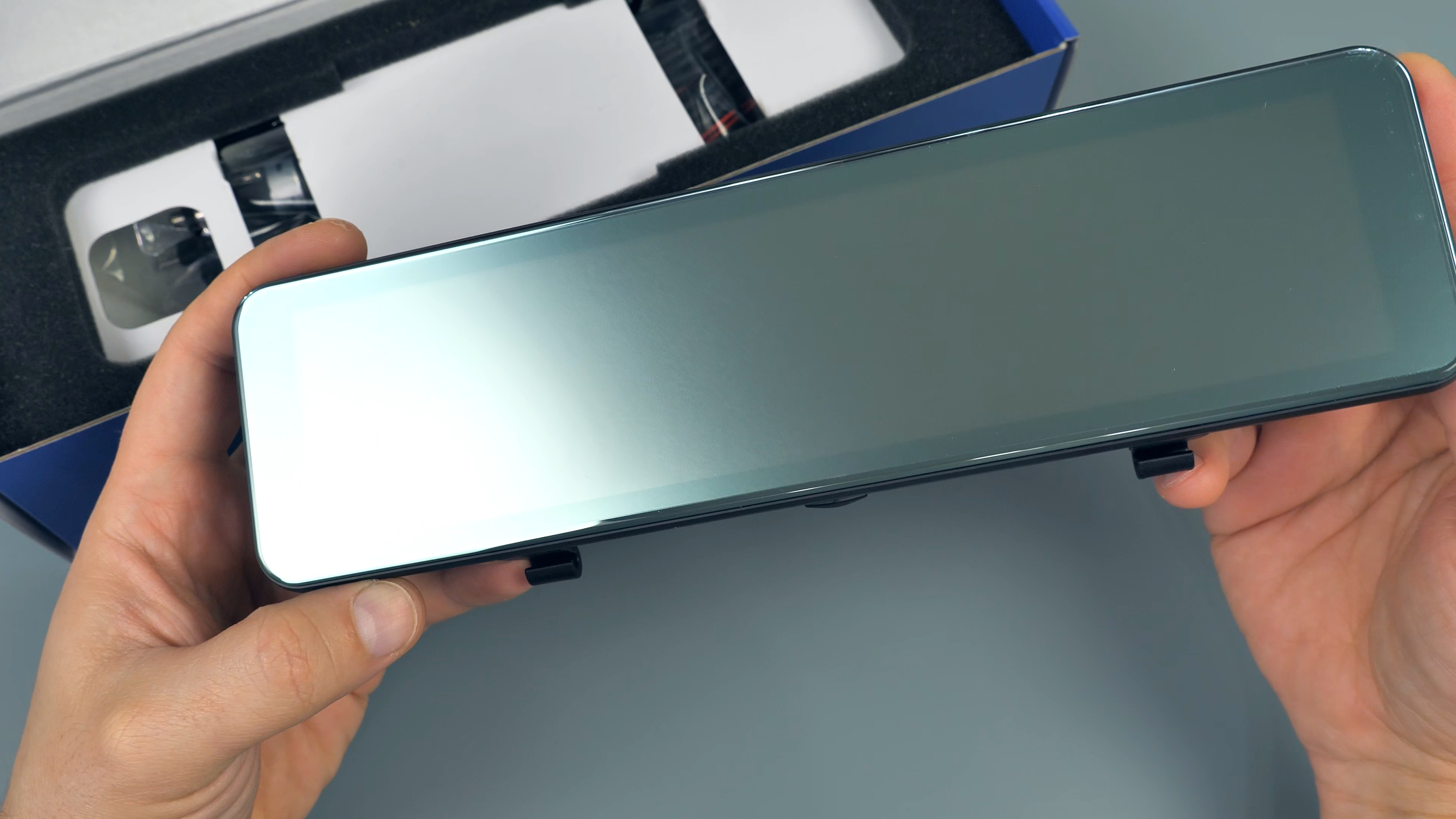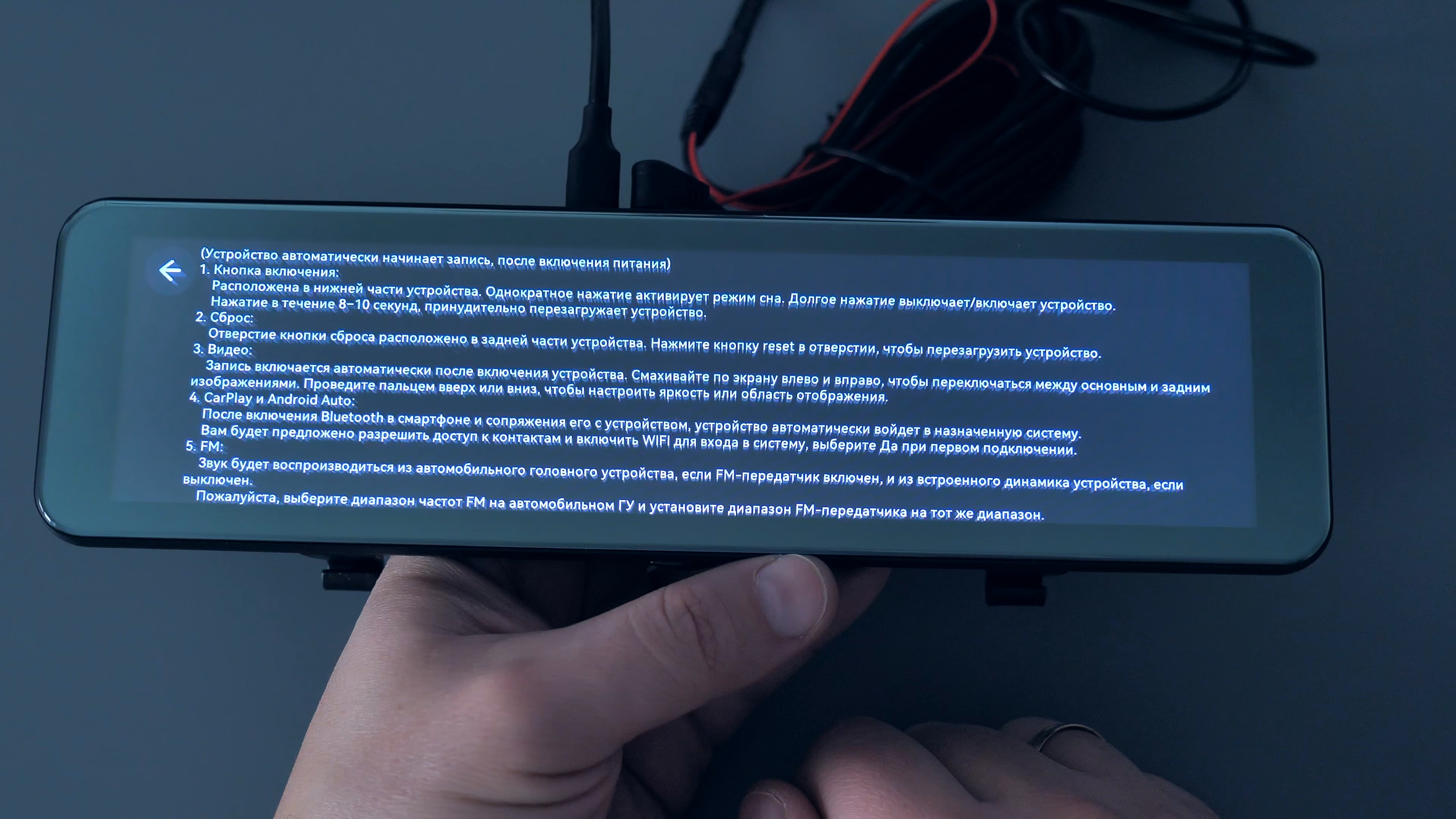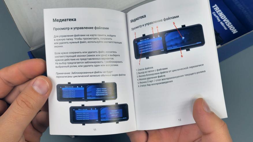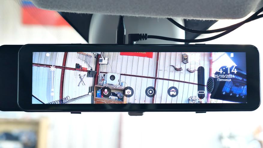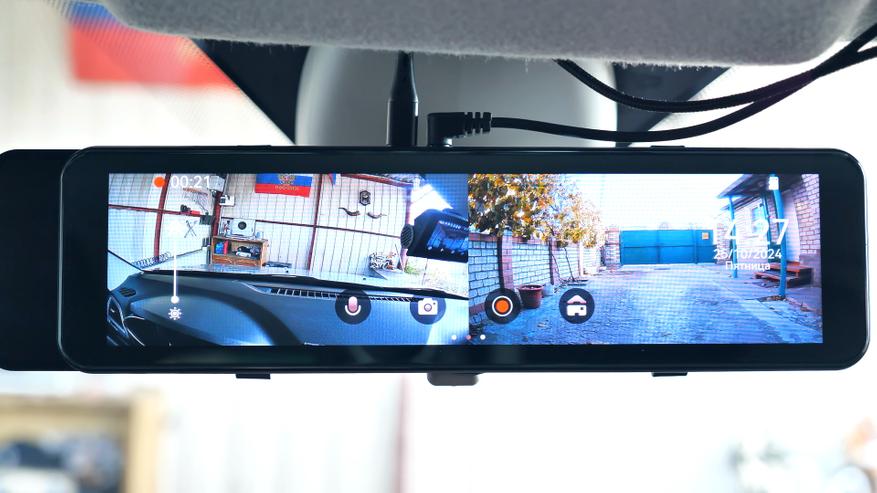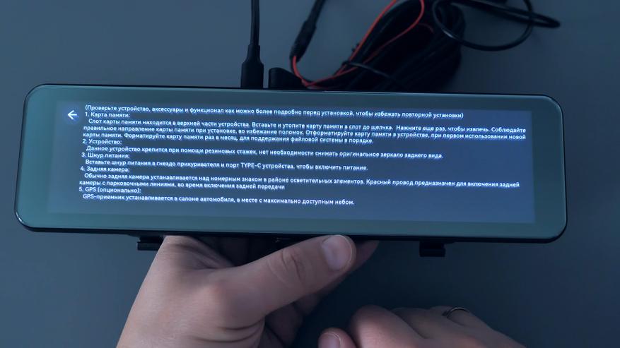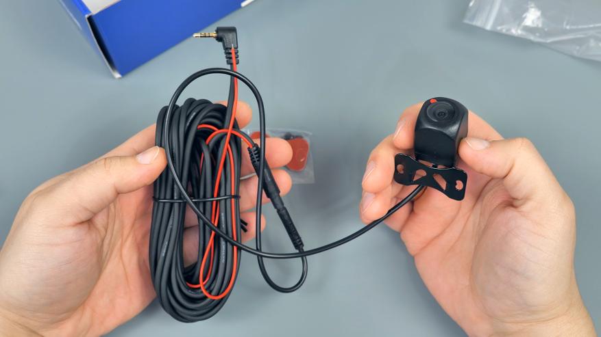 В комплекте с зеркалом идут: 2 резиновые стяжки для фиксации зеркала-регистратора на штатном зеркале автомобиля; блок питания в прикуриватель автомобиля с USB Type-C разъёмом, блок способен работать как в 12V бортовой сети автомобиля, так и в 24V, мощность устройства составляет 15W и способно выдавать до 3А тока при 5V; подробная иллюстрированная инструкция пользователя на русском языке; задняя внешняя камера с 6-ти метровым удлинительным кабелем, он имеет ответвление в виде красного провода, который подключается к лампе заднего хода автомобиля; а также двухсторонний скотч и/или два винта для установки задней камеры.