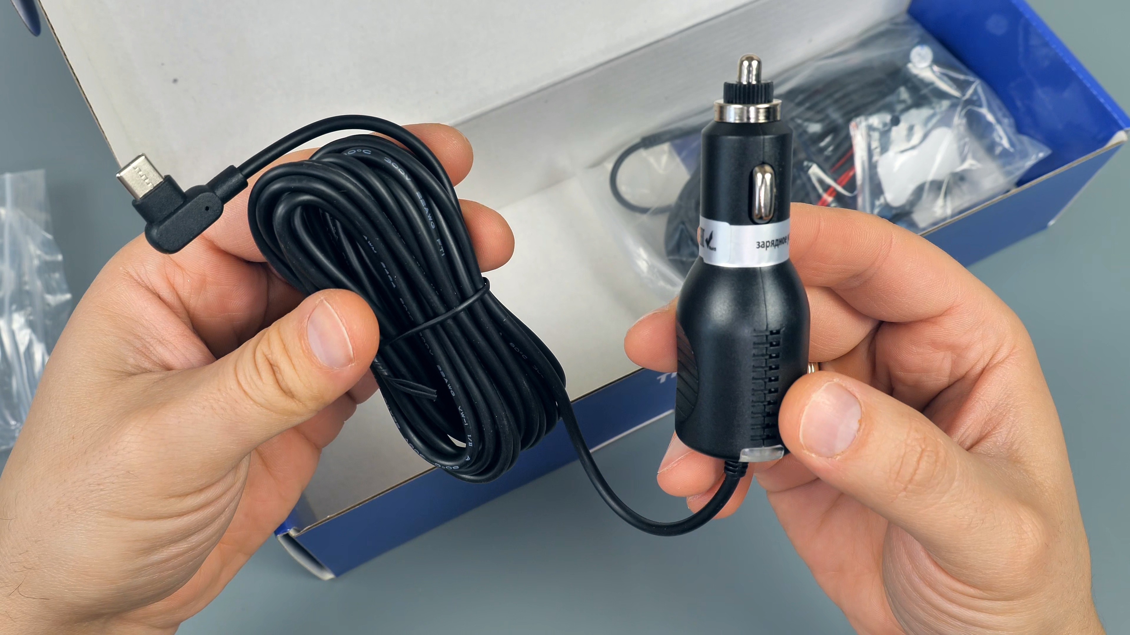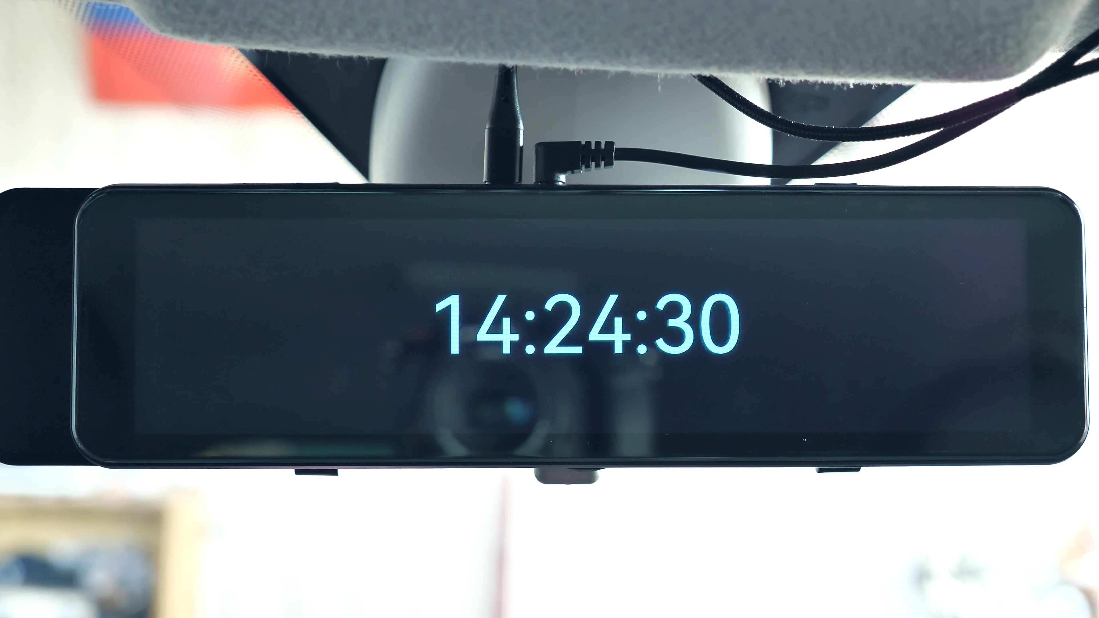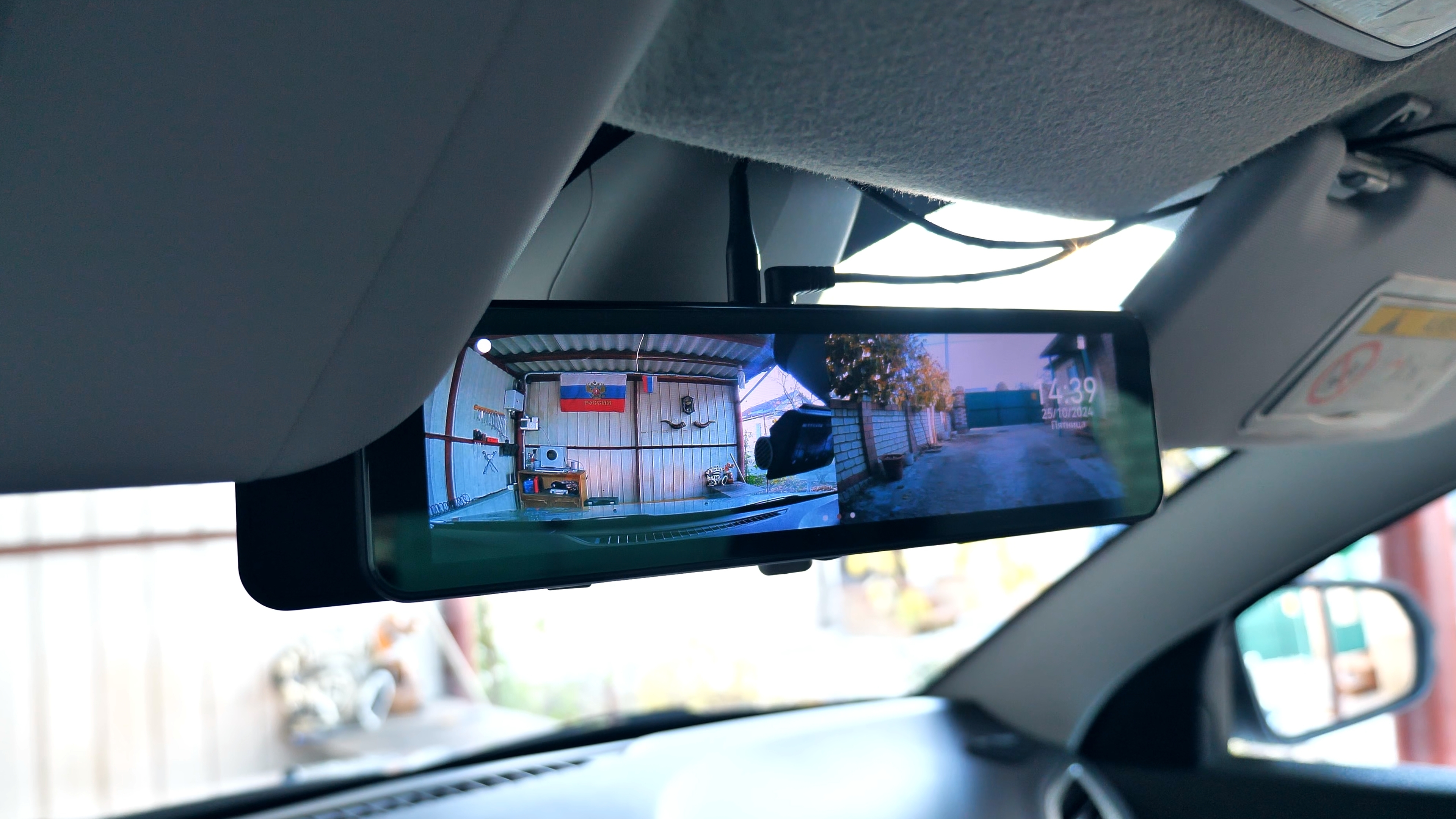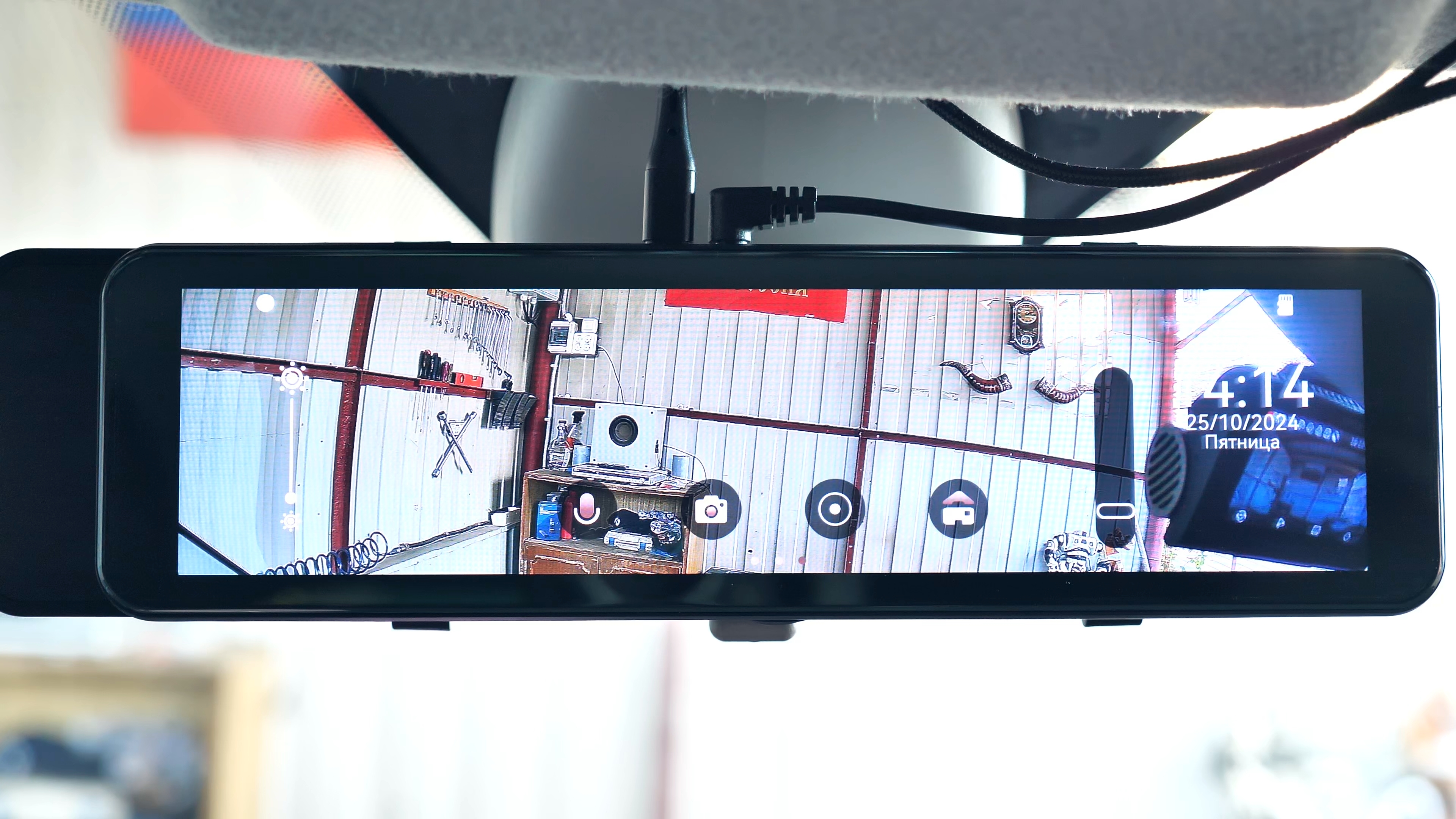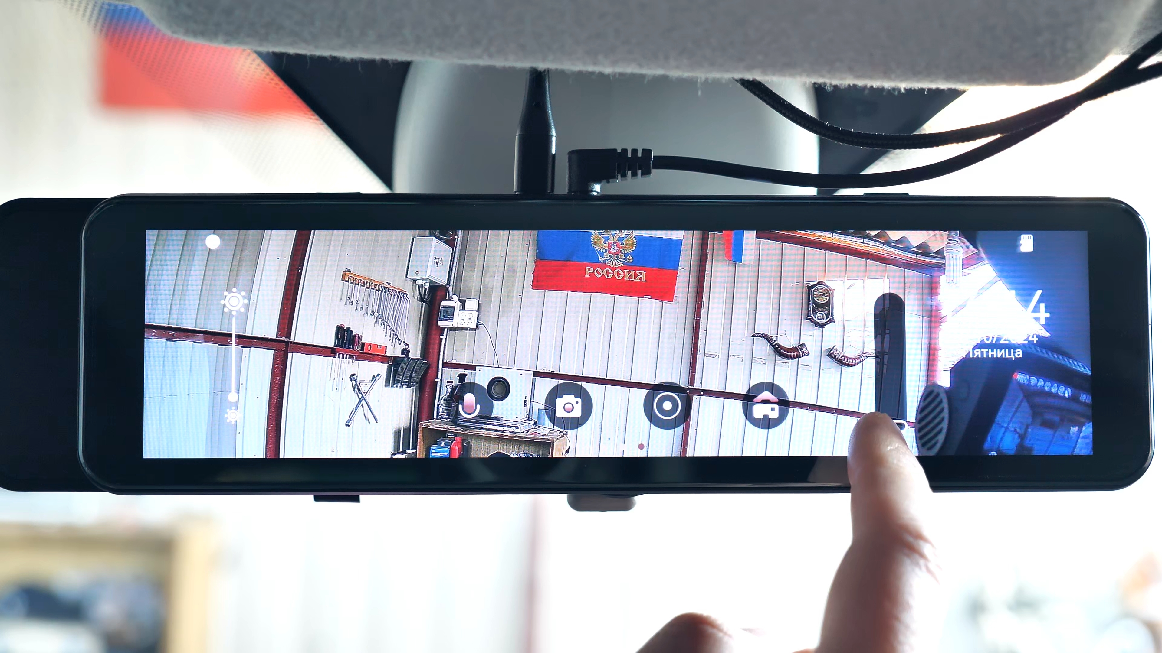 В комплекте с зеркалом идут: 2 резиновые стяжки для фиксации зеркала-регистратора на штатном зеркале автомобиля; блок питания в прикуриватель автомобиля с USB Type-C разъёмом, блок способен работать как в 12V бортовой сети автомобиля, так и в 24V, мощность устройства составляет 15W и способно выдавать до 3А тока при 5V; подробная иллюстрированная инструкция пользователя на русском языке; задняя внешняя камера с 6-ти метровым удлинительным кабелем, он имеет ответвление в виде красного провода, который подключается к лампе заднего хода автомобиля; а также двухсторонний скотч и/или два винта для установки задней камеры.