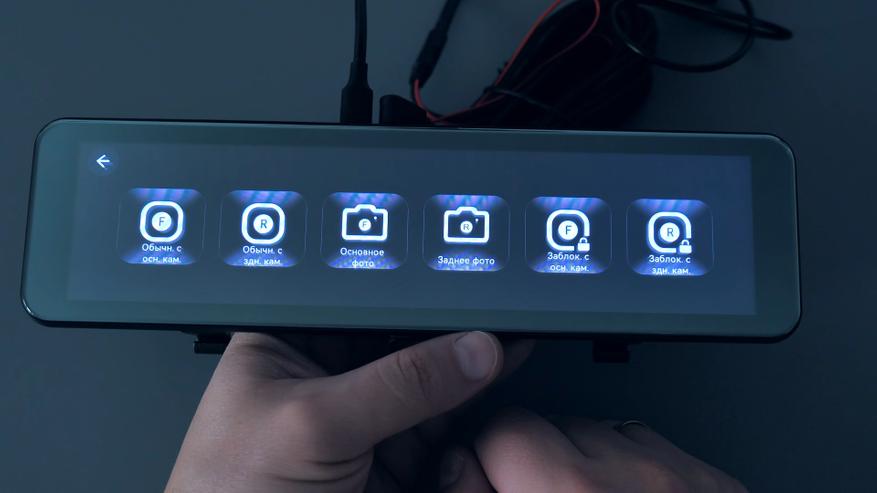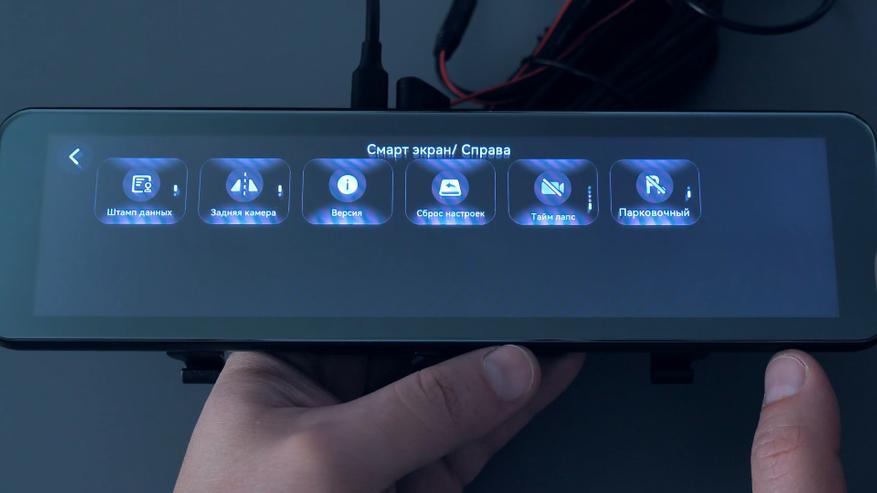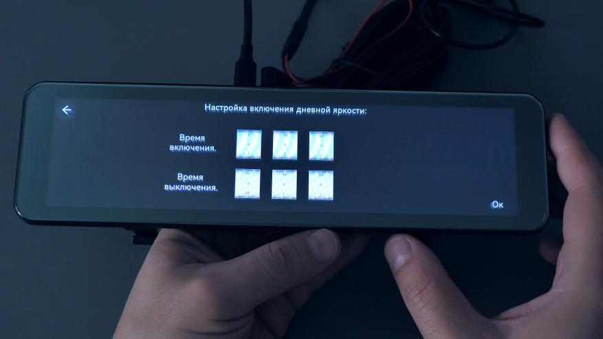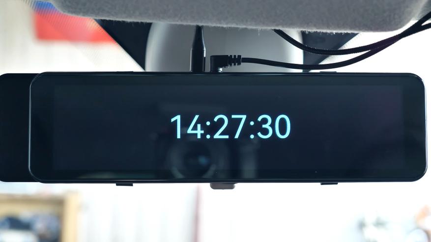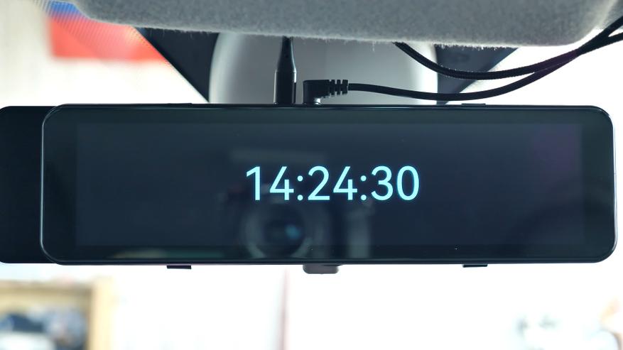 При работе по датчику удара зеркало на парковке будет неактивно и включится только при ударе по кузову автомобиля, запишет короткий видеоролик и снова отключится до следующего удара. В режиме таймлапс зеркало будет снимать непрерывно с обеих камер с фреймрейтом 1 кадр в секунду на протяжении выставленного в настройках временного интервала — 2, 8, 12 или 24 часа или же до включения зажигания, что наступит раньше. В таком режиме записи не занимают много места на карте памяти и искать необходимый момент будет быстрее и проще. Так например, в одной минуте такого видео содержится полчаса реального времени и занимает на карте памяти всего 195МБ, это объём записей с обеих камер; один час реального времени или 2 минуты такой записи занимают на карте памяти 390МБ, и так, например, 8-часовая ночная стоянка займёт на карте памяти 3,2ГБ, а сутки такой непрерывной записи, то есть 24 часа, займут 9,3ГБ, и так, например, на карту памяти объёмом 128ГБ сможет поместиться чуть более 13 суток, вот только аккумулятор автомобиля за это время разрядится и чтобы этого не произошло в настройках зеркала максимальный интервал работы в этом режиме составляет не более 24 часов, после чего зеркало отключается, чтобы по возвращению водитель мог гарантированно завести свой автомобиль.