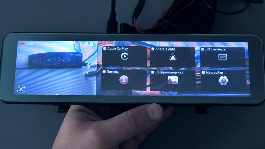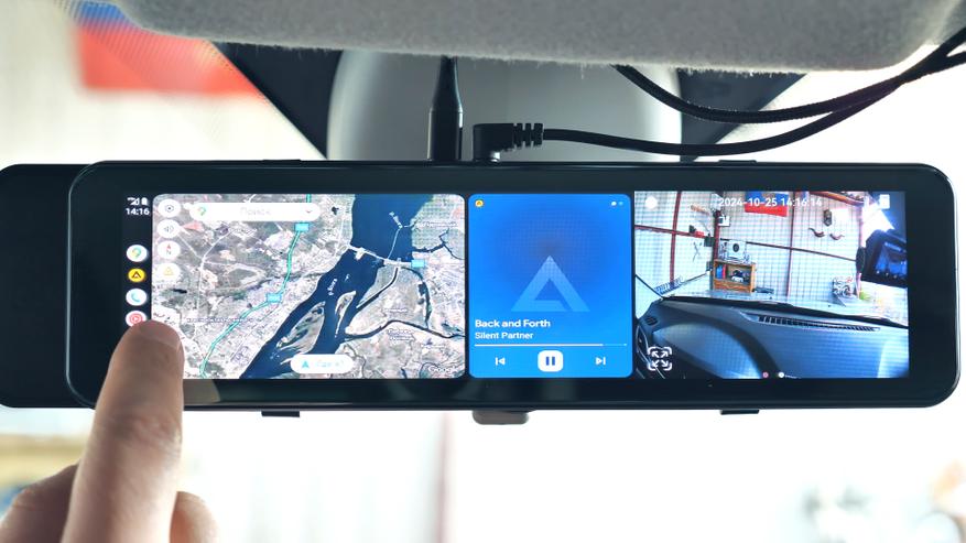 Зеркало имеет большой 11 дюймовый IPS дисплей, на который можно выводить видеопоток с обеих камер, навигатор, плеер и другие полезные приложения для водителя, так как зеркало поддерживает функции CarPlay и AndroidAuto. Зеркало способно транслировать звук на любую автомобильную магнитолу по FM каналу, так как имеет встроенный FM-трансмиттер, благодаря чему с этого зеркала можно слушать музыку, получать голосовые и звуковые уведомления по громкой связи на штатную акустику автомобиля и конечно же пользоваться функцией Hands Free — общаться через зеркало с абонентами по телефону, не отвлекаясь от дороги.