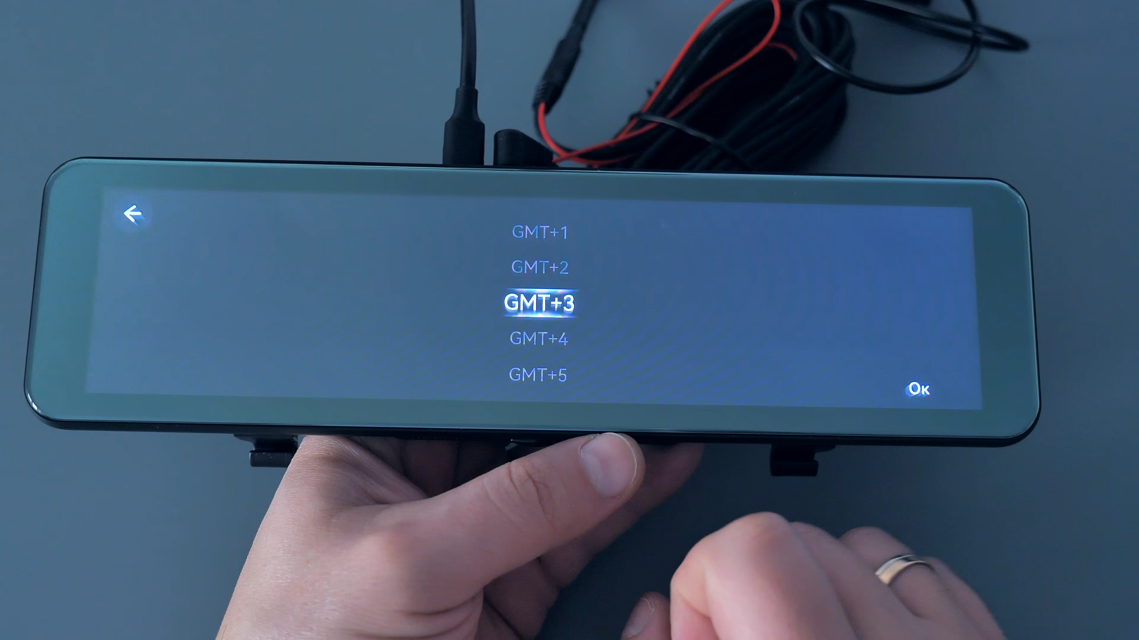 Далее по настройкам можно выбрать разрешение записи основной камеры — 2K или 4K, задняя камера при этом всегда снимает только Full Hd и изменить это разрешение нельзя. Поскольку регистратор пишет циклично, то можно указать длительность записываемых видеофайлов — 1, 3 или 5 минут. Можно сменить язык системы (языков много, в том числе и русский); можно скорректировать часовой пояс; отформатировать карту памяти; указать частоту бытовой электросети для подавления мерцаний на ночных записях при искусственном освещении; включить/выключить отображение штампа даты и времени на записях; отзеркалить отображения картинки с задней камеры; посмотреть версию ПО и при необходимости обновить его; произвести сброс настроек; а также включить функцию наблюдения на парковке таймлапс или же по датчику удара.