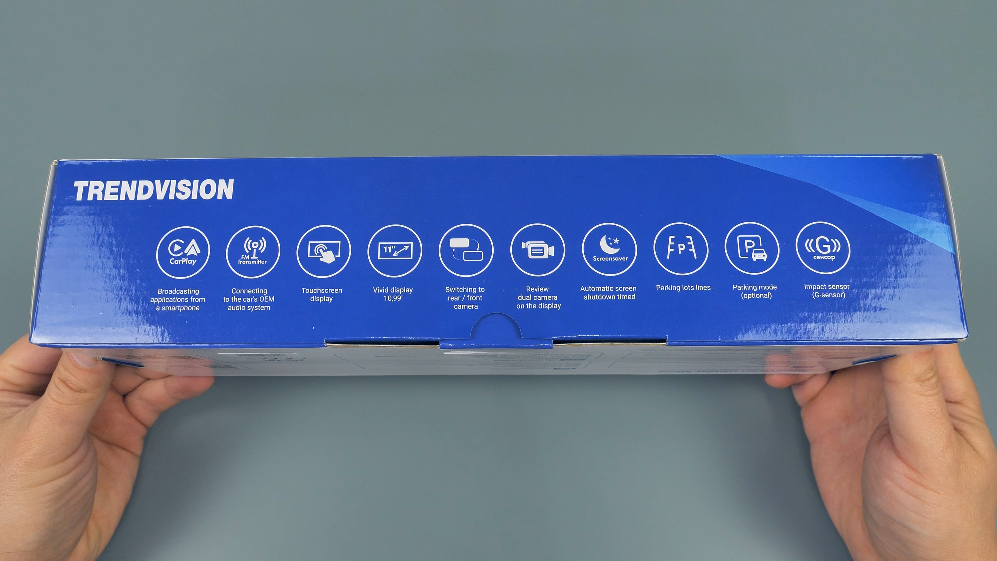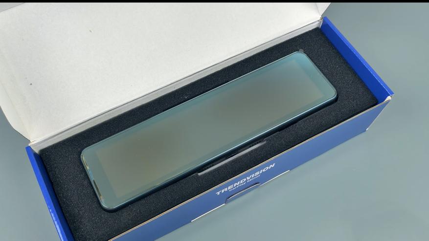 Поставляется зеркало в фирменной бело-синей коробке TrendVision, на которой указаны все основные технические характеристики устройства.