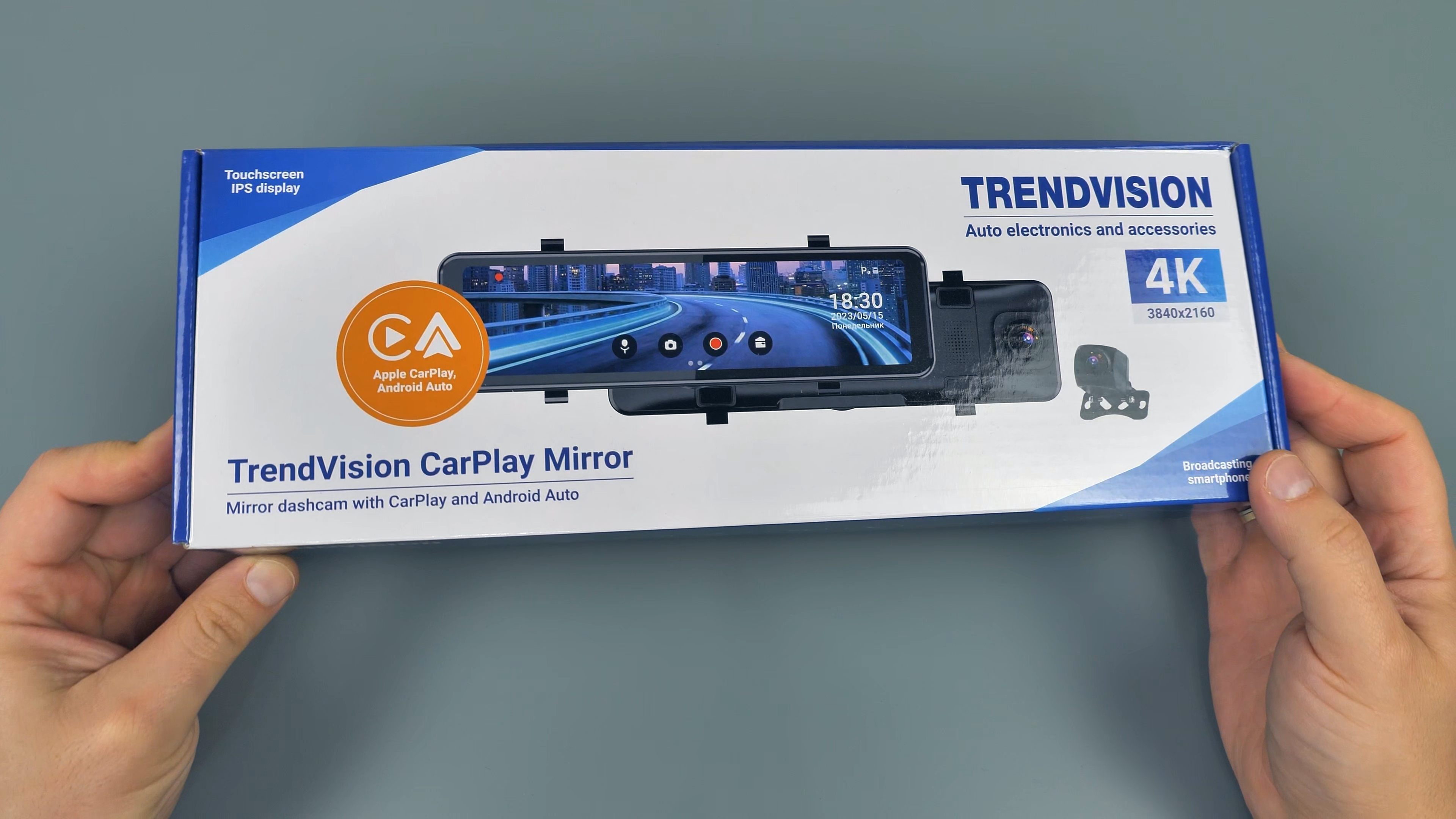TrendVision CarPlay Mirror — это многофункциональное зеркало-регистратор от российского бренда TrendVision, оно имеет 2 камеры — одна основная, фиксирующая дорожную обстановку впереди автомобиля и способная вести съёмку в высоком разрешении 4К, и вторая — задняя, фиксирующая дорожную обстановку позади автомобиля.