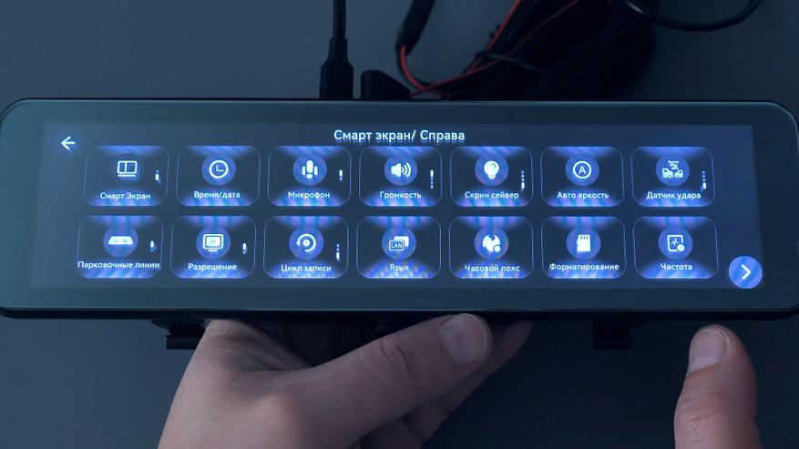 Есть раздел с настройками, их много. Можно переключить расположение смарт-экрана — слева или справа от трансляции, можно настроить дату и время, включить/выключить запись звука, отрегулировать громкость внешнего динамика или отключить звук вовсе, активировать скринсейвер и задать таймер на его включение — 30,60 или 180 секунд.