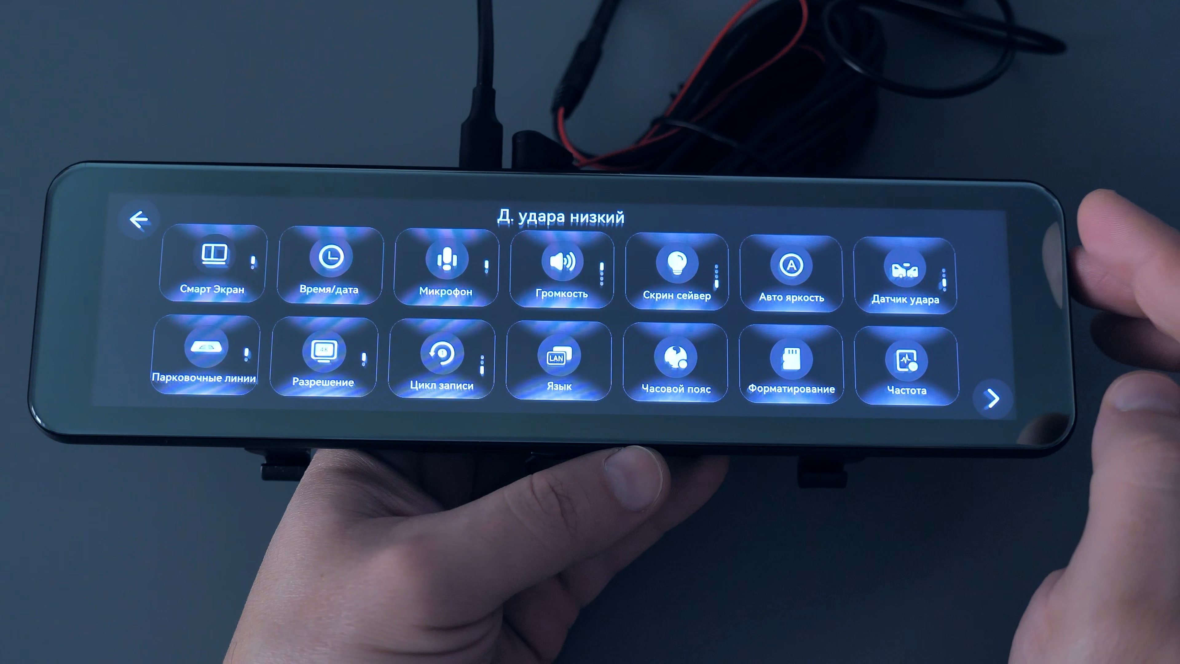 Далее по настройкам можно указать временной интервал дневного режима, при котором яркость дисплея будет составлять 100% яркости, а вне этого периода яркость автоматически снижается до 50%. Можно настроить чувствительность датчика удара или отключить его вовсе и включить/выключить отображение парковочных линий. Линии накладываются на поток с задней камеры в момент включения задней передачи для удобства и повышения безопасности движения задним ходом и парковки.